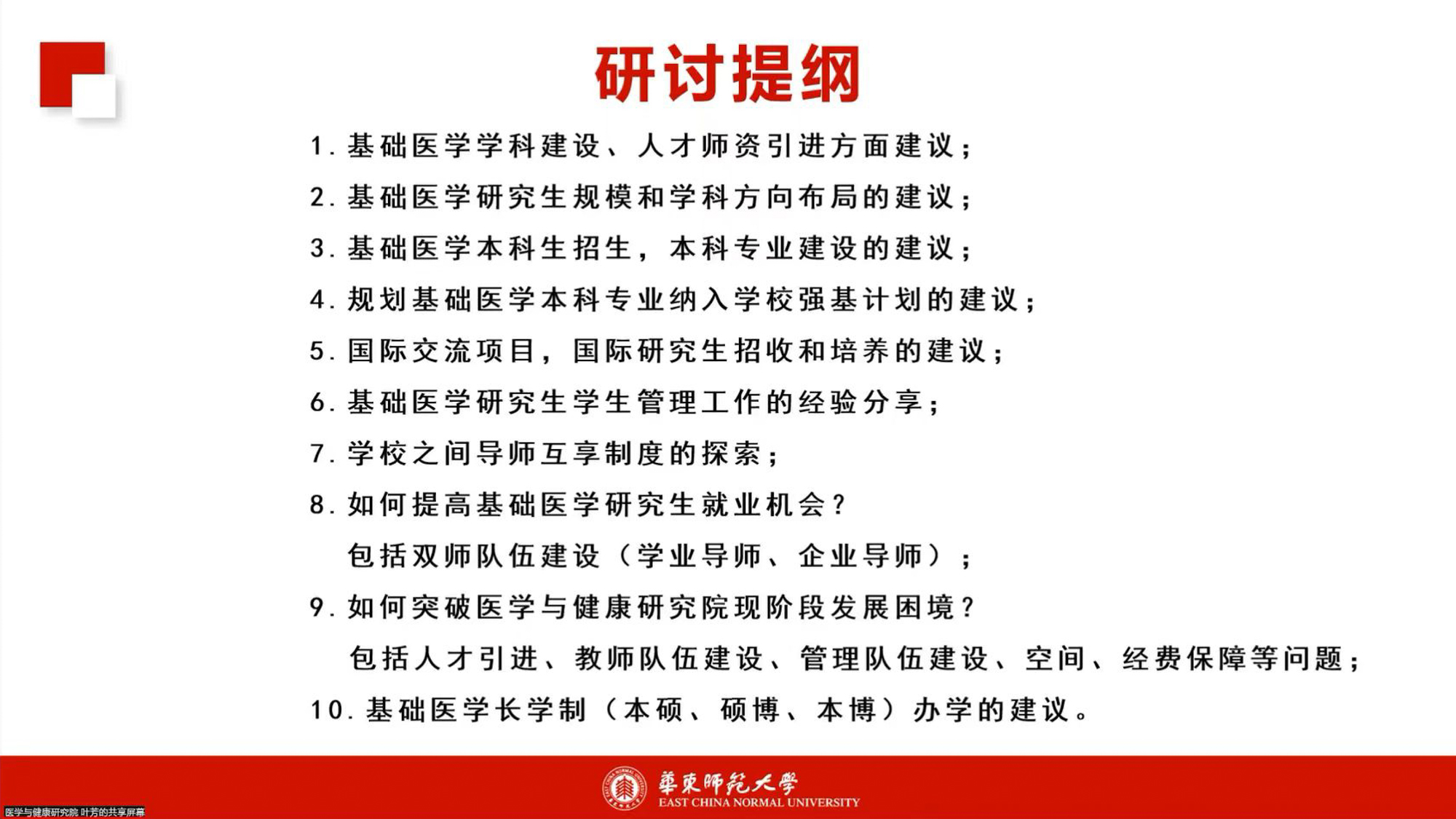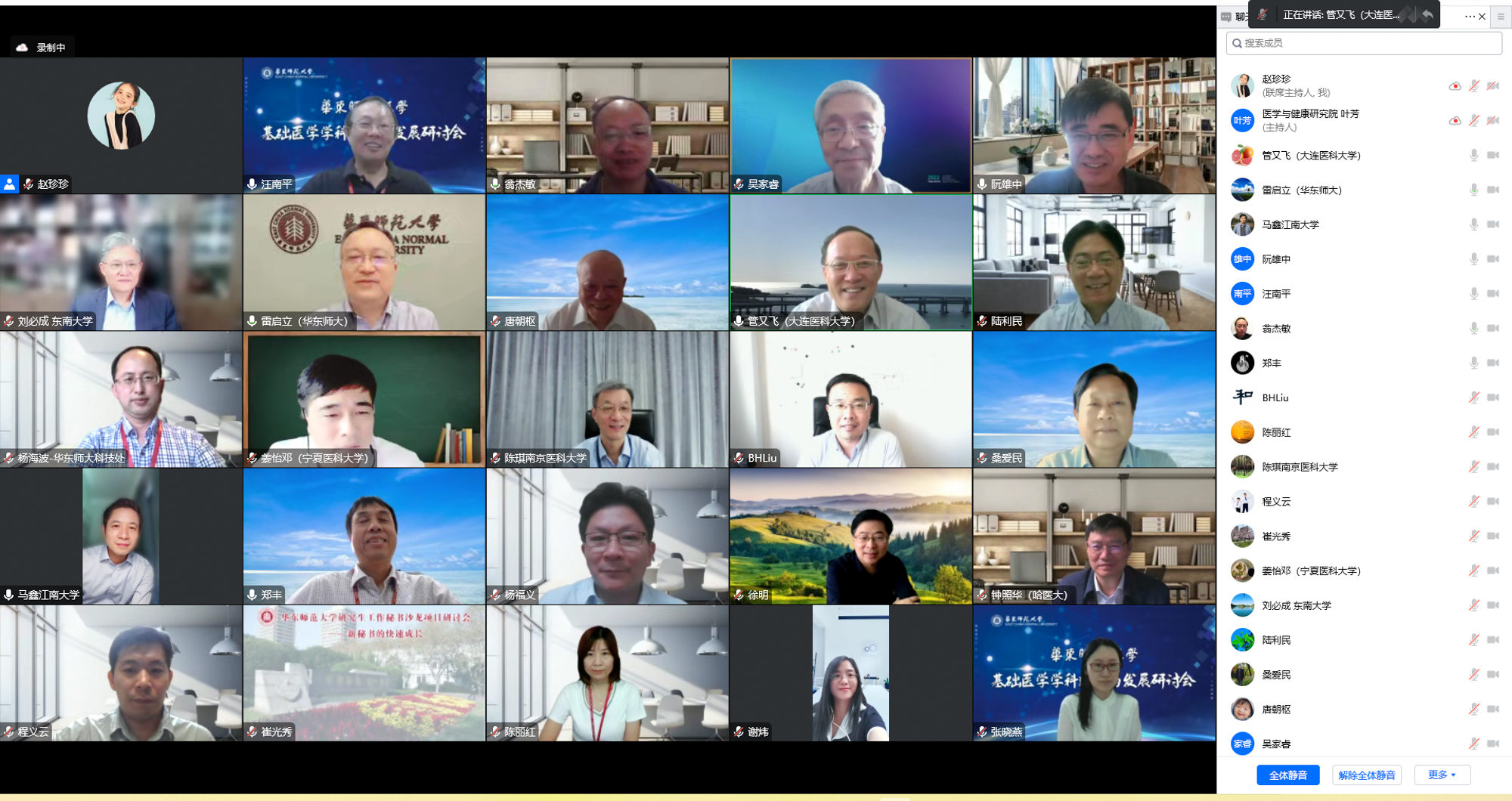 在学校及各相关职能部门和院系的大力支持之下,医学与健康研究院各项事业得到迅速的发展。今年7月正式获批基础医学博士学位授权点,并正式开始招生。为进一步优化基础医学博士和硕士研究生培养的目标和方向,扎实推进华东师大基础医学专业学生培养工作,提高基础医学学术学位研究生培养质量,充分做好第一届基础医学研究生教育的准备工作,由华东师大医学与健康研究院主办的基础医学学科建设和发展研讨会于9月26日在线上召开。