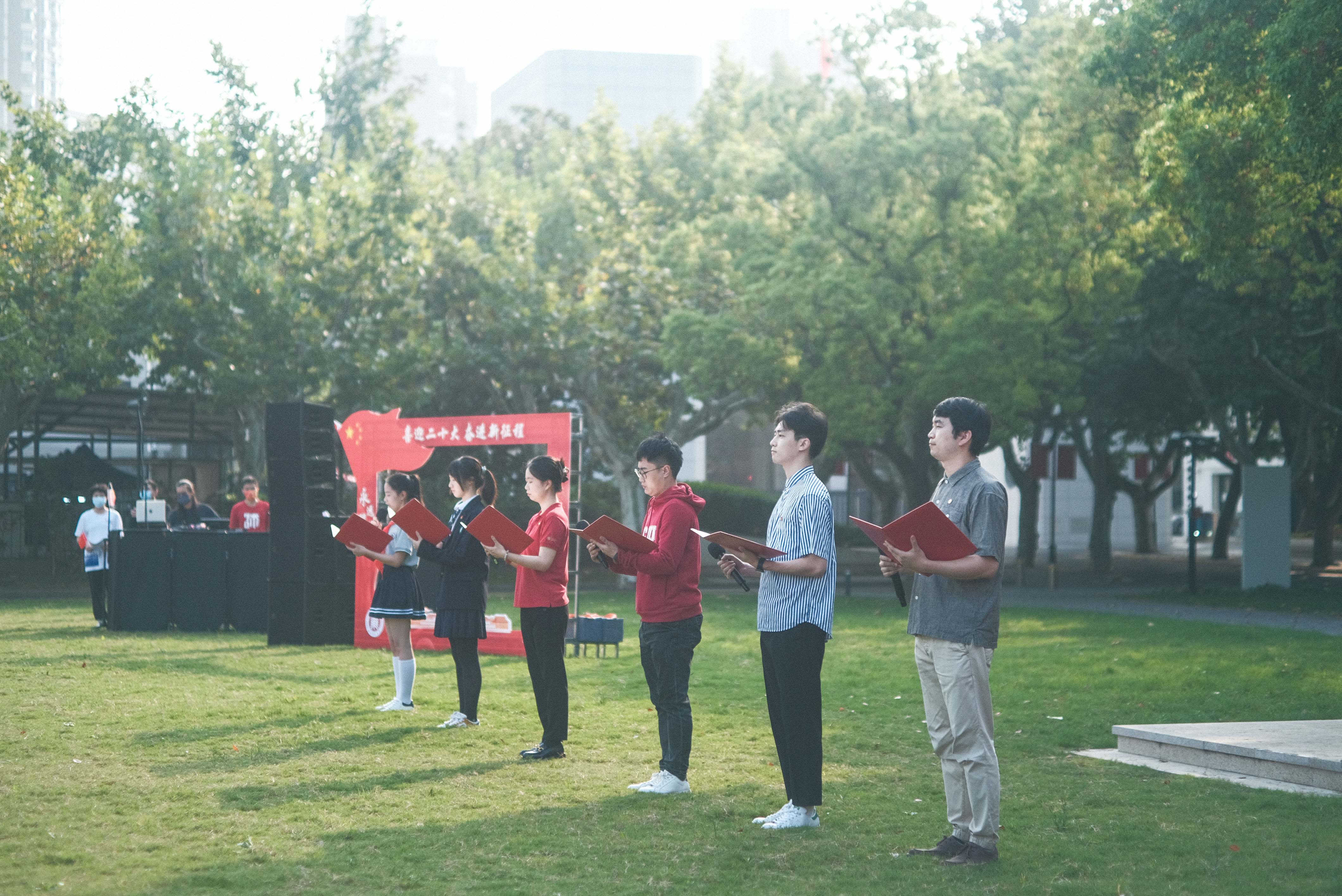 在普陀校区活动现场,来自华东师大附属中学的学生代表、华东师大学生及青年教师代表齐聚国旗下,他们中有少先队员、共青团员、也有中共党员,他们以青春之声告白祖国,以青年之力勇担重任。