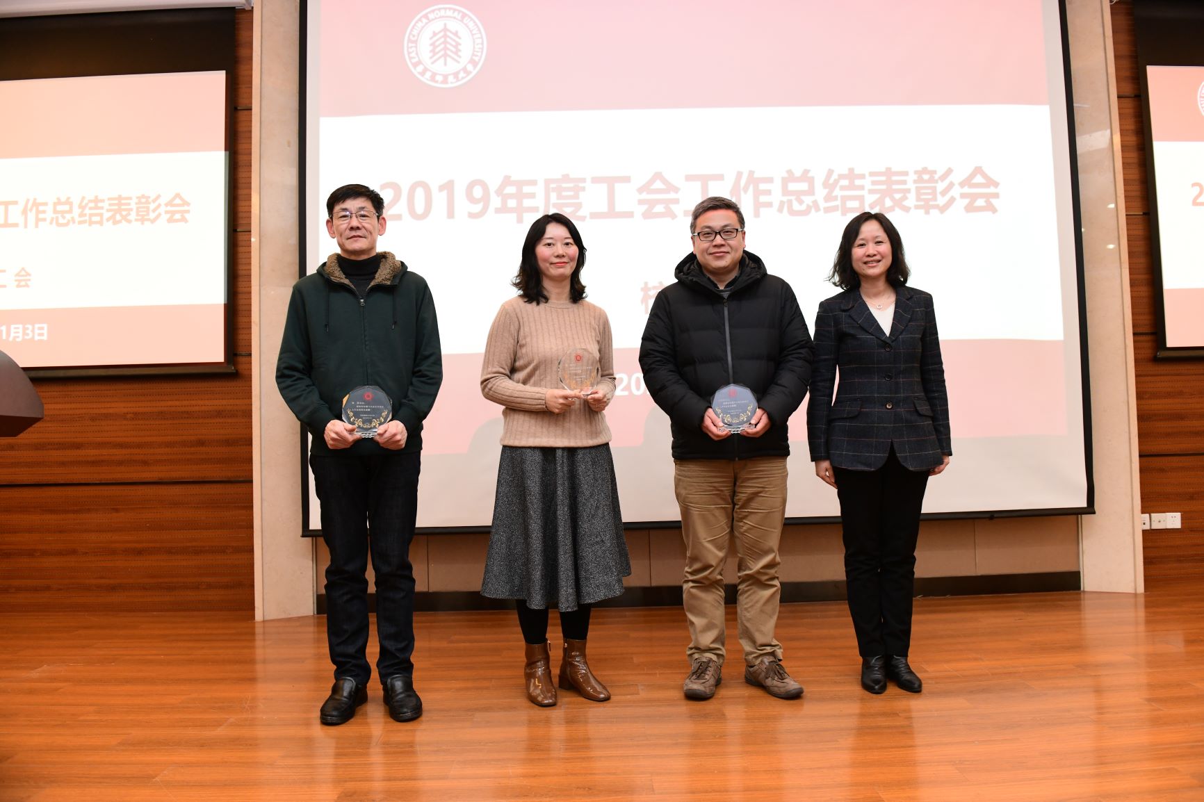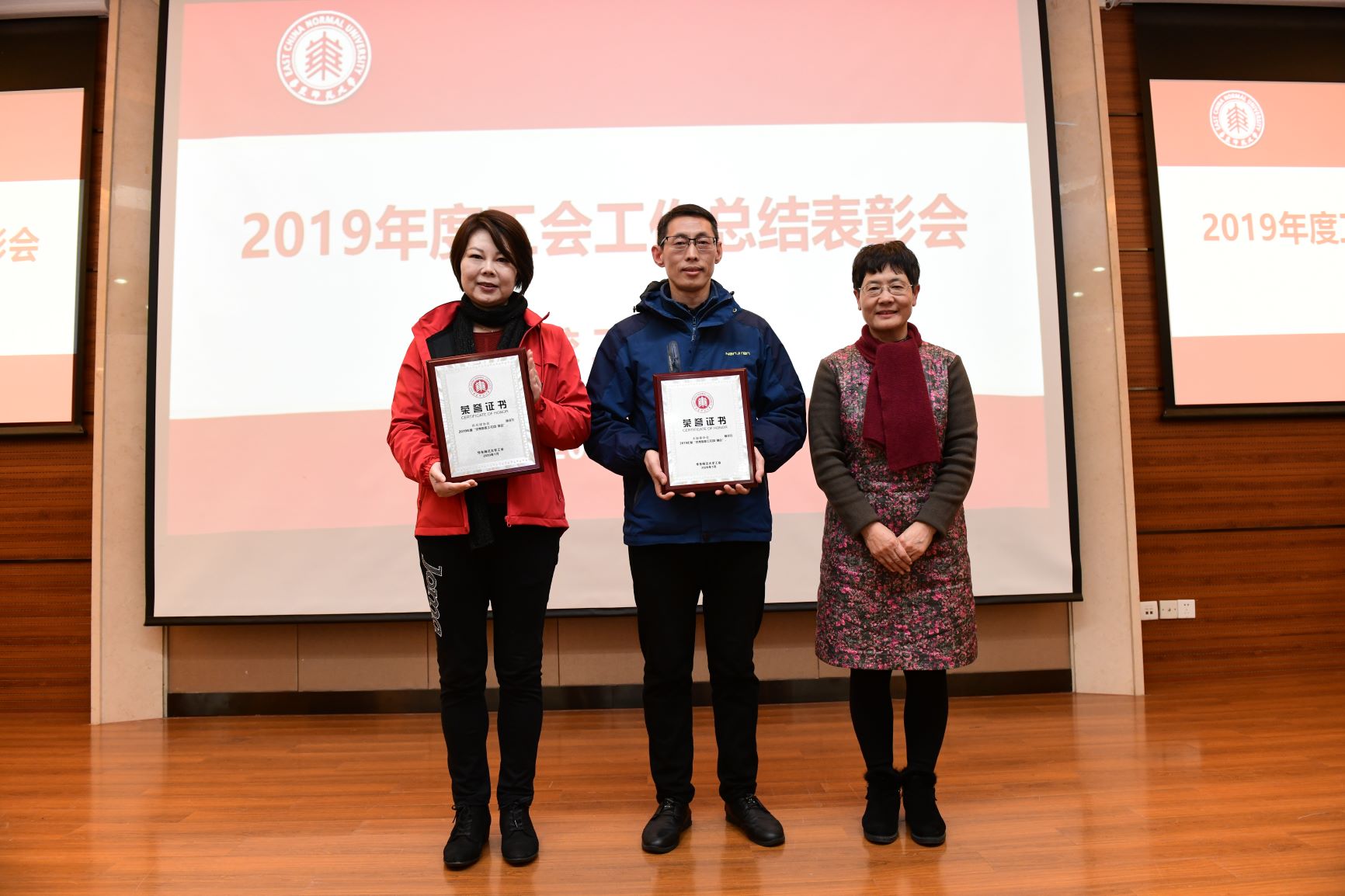 校工会副主席陈立侨、校工会“两委委员”嵇渭萍为2019年度校先进“教工小家”颁奖