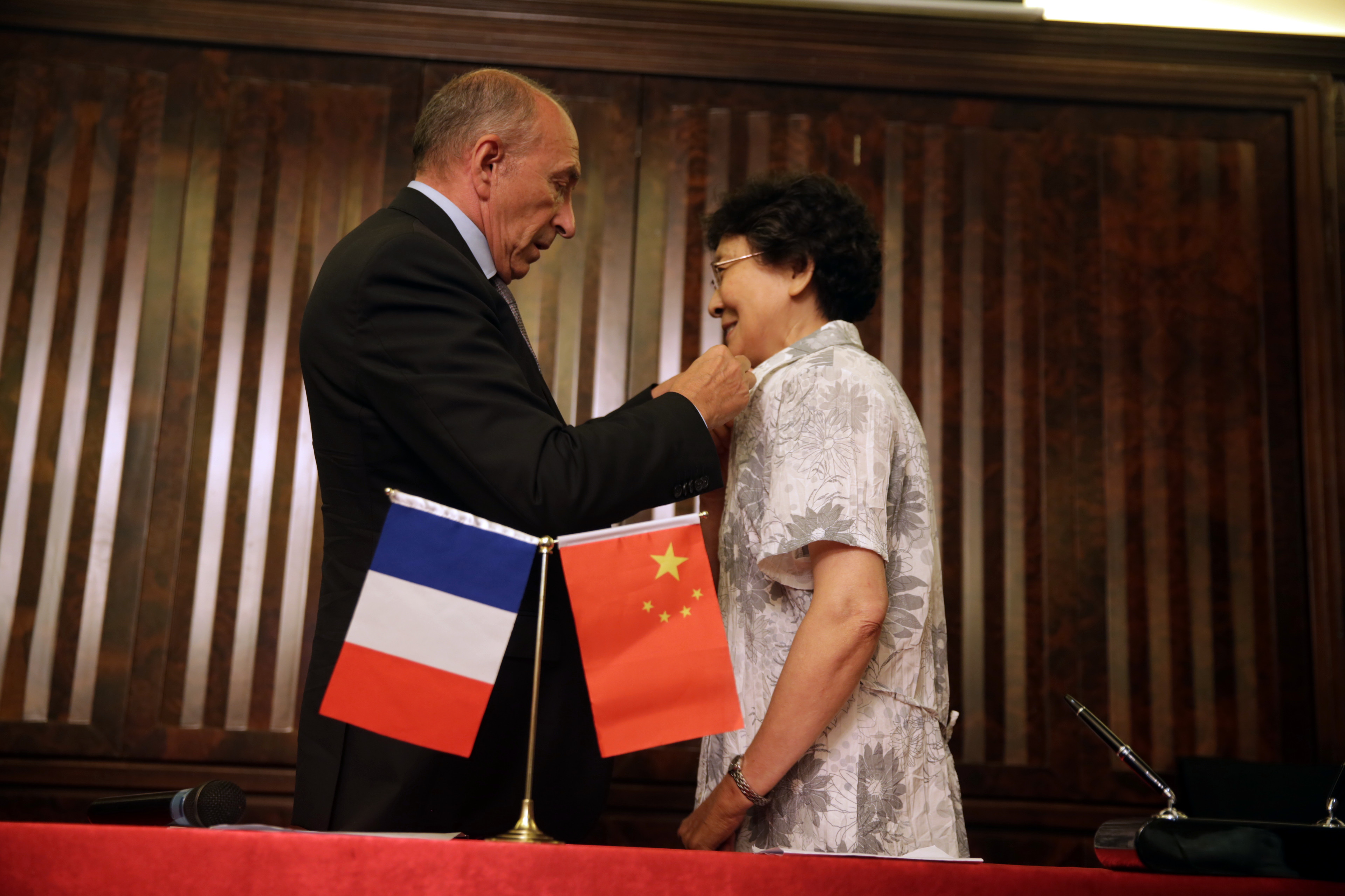 2015年6月,法国里昂市时任市长Gérard COLLOMB代表法国政府授予我校原中法项目资深主管钱蕴华女士法国棕榈叶教育骑士勋章