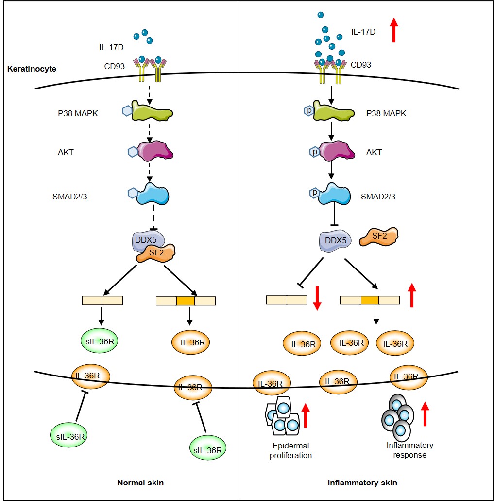 赖玉平教授团队的研究揭示IL-17D- CD93抑制角质形成细胞中DDX5的表达会加重皮肤炎症,提示IL-17D和DDX5可作为炎症性皮肤病的治疗靶点。另外,sIL-36R的鉴定为RNA剪接异常如何参与皮肤炎症的发生提供了新见解,也为AD和银屑病的治疗提供了新的、可替代的药物。