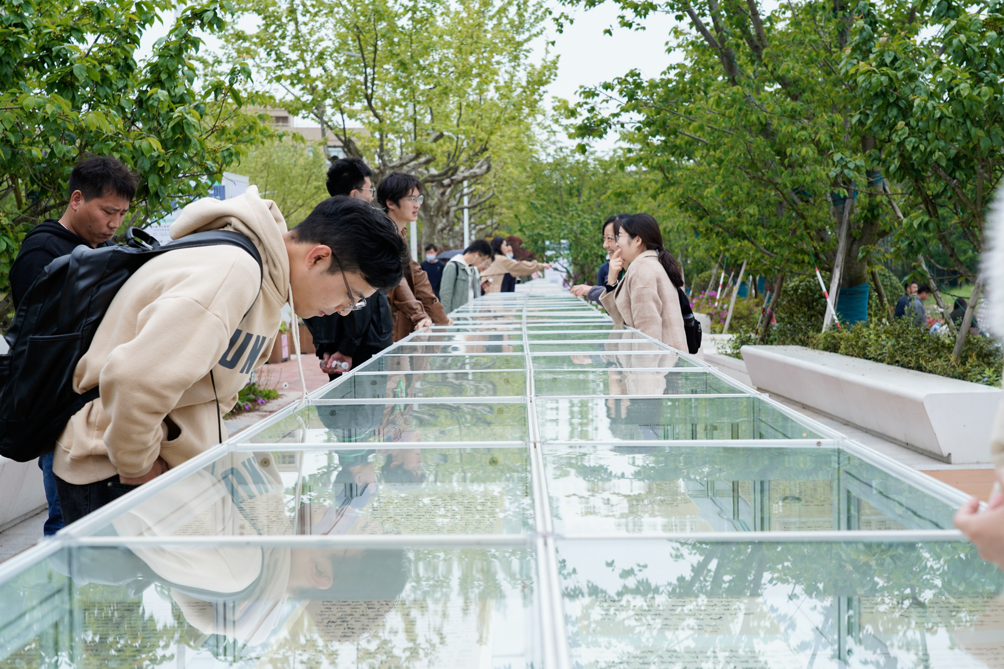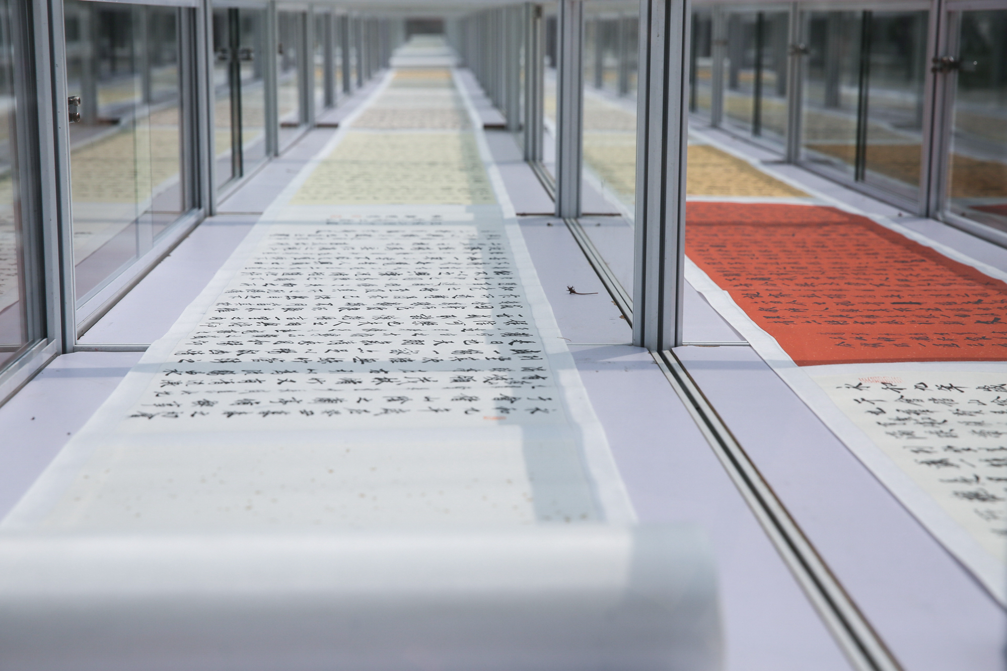 百幅《兰亭序》作品临作装裱成了10个手卷,陈列在玻璃柜中在临河的道路中央绵延了120米,拉开了校园兰亭书法节的序幕。不少同学驻足拍照、打卡,品赏着中国书法的经典。