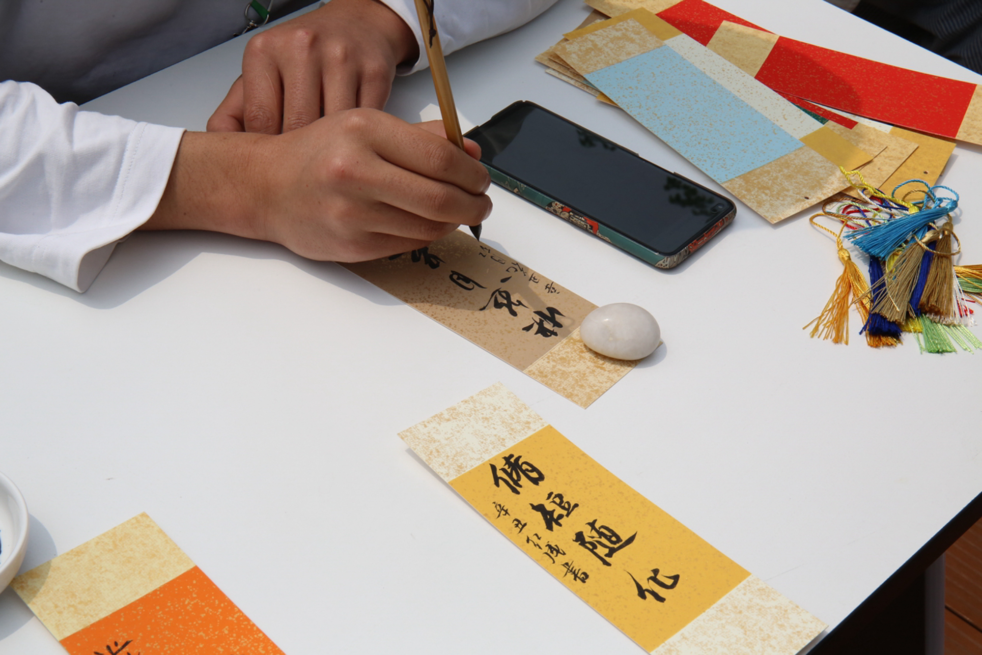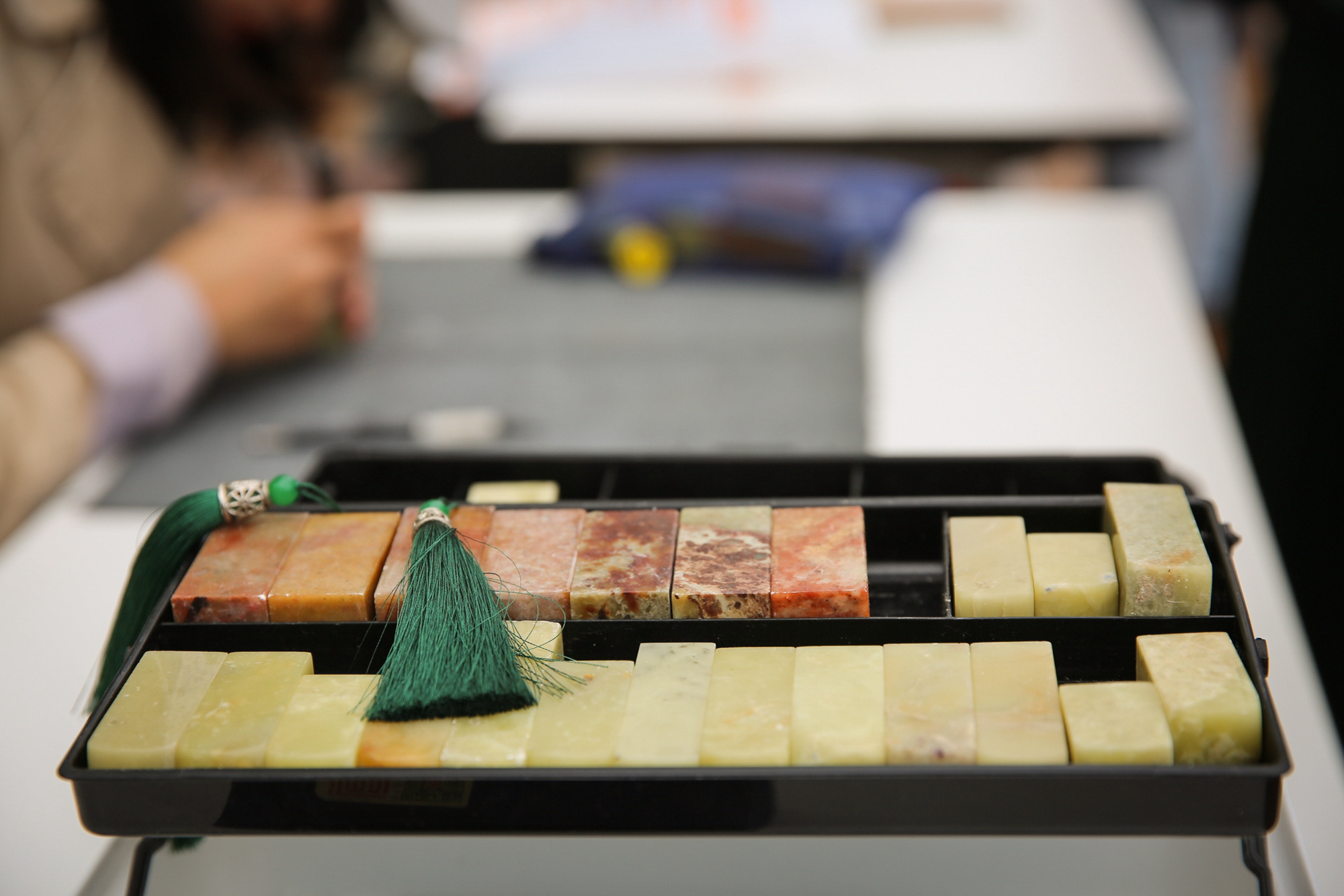 展览现场特别设置了书写兰亭区和篆刻体验区。活动现场为同学们送出了“惠风和畅”“快然自足”“畅叙幽情”等兰亭警句书签。爱好篆刻的同学还现场动刀试刻,品尝体验,周边还陈列了以《兰亭序》为主题的十个展板。从《兰亭序》的诞生,上巳节的活动,再到《兰亭序》的版本流变以及《兰亭序》在域外的交流等方面,深入诠释《兰亭序》的文化价值,成为户外活动的亮点。