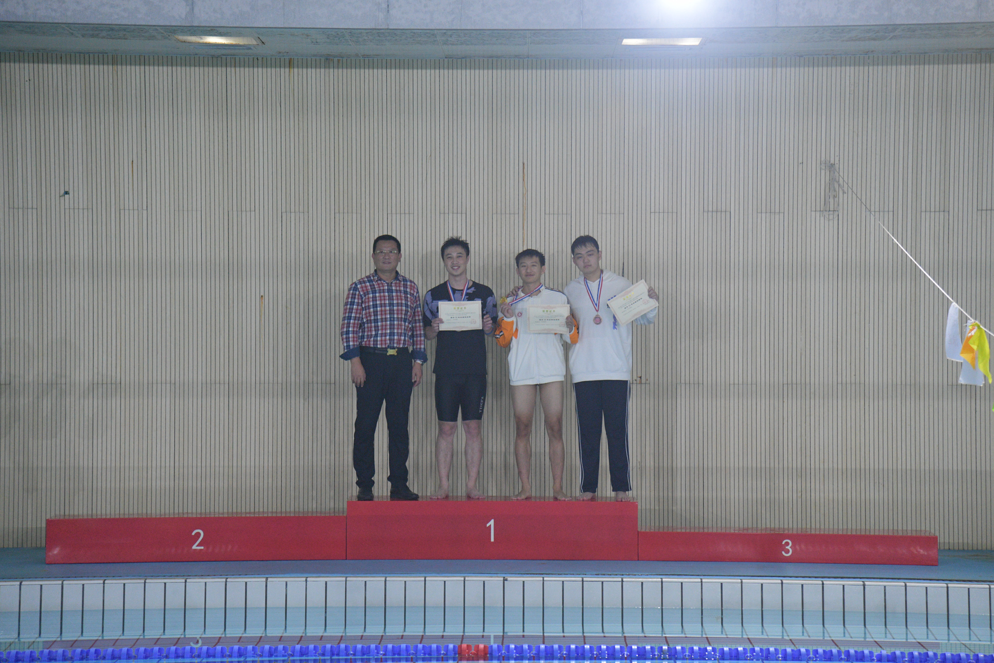 体育与健康学院副院长陈海涛为男子50米自由泳获奖学生颁奖