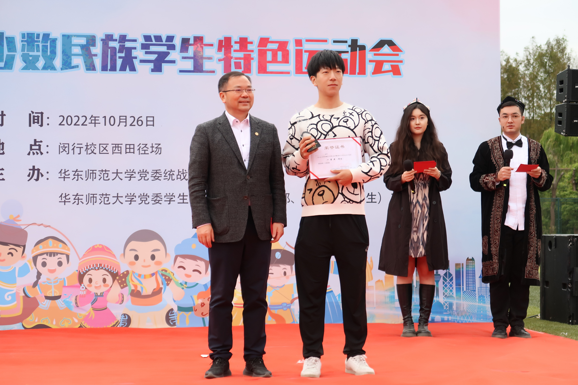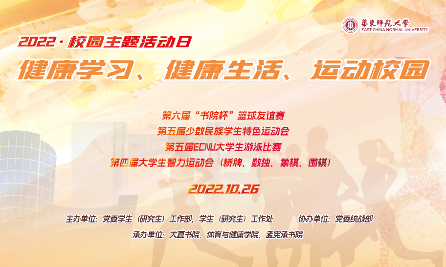 10月26日,为实践健康第一的教育理念,促进体育与教育的融合,进一步引导广大青年学生树立健康学习、健康生活的意识,倡导学生积极参加体育运动,强健体魄,养成健康的生活方式,促进学生身心健康和德智体美劳全面发展,华东师大2022年“健康学习、健康生活、运动校园”校园主题活动日拉开帷幕。本次主题活动日形式多样、精彩纷呈,校级活动包括第六届“书院杯”篮球友谊赛、第五届少数民族学生特色运动会、第五届ECNU大学生游泳比赛、第四届大学生智力运动会等。副校长周傲英出席活动并为获奖学生颁奖,近千名学生参与各类项目角逐、展现青春风采。