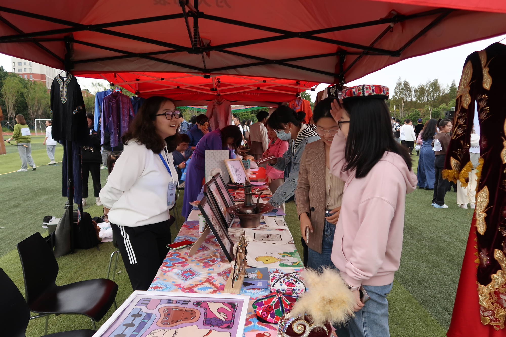 此外,活动还设置了展示区和体验区。在宣传展示区,民族特色体育活动宣传板详细介绍了多项极具代表性的少数民族传统体育项目。在观摩体验区,新疆舞、西藏舞、蒙古舞、竹竿舞等民族特色舞蹈更是精彩绝伦;藏式抱石、押加和有奖问答等活动让观赏的同学融入其中。同时,藏文化社、博格达社团、蒙古族学生代表在展示区搭设了展台,进行民族文化宣传,通过展出各自民族的特色物件、明信片、食品等方式,帮助其他同学了解其民族文化,全方位呈现我校各民族同学团结奋进、幸福和谐的精神风貌。