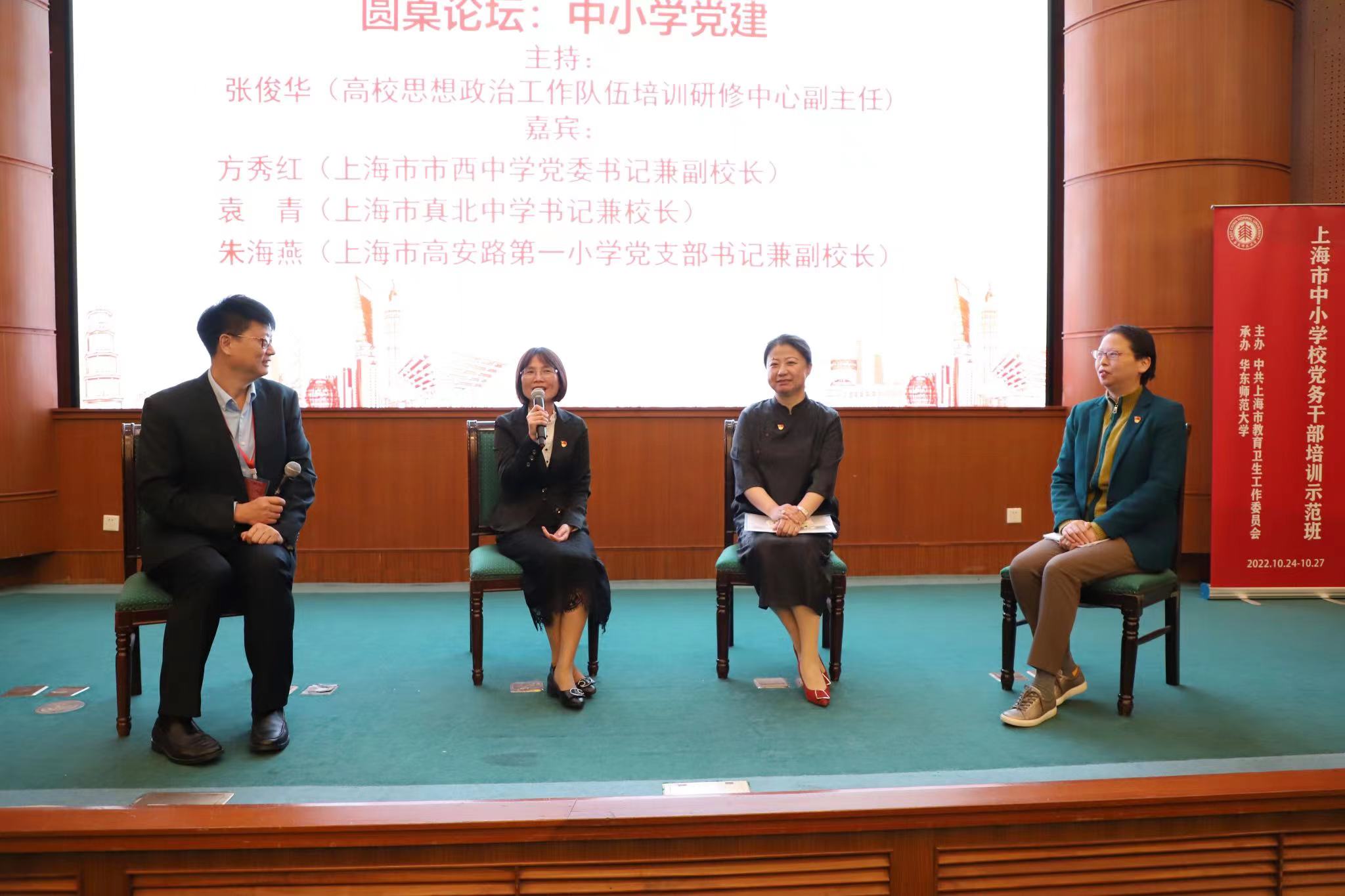 在上海市中小学校党务干部培训示范班,上海市南洋模范中学党委书记陈宏观、3245澳门新莆京附属小学党支部书记兼校长严玮懿、曹杨第二中学党委书记侯文英、西南位育中学党委书记金琪,分别分享了学校党建工作经验,以及作为基层党务工作者的心得体会。市西中学党委书记兼副校长方秀红结合实际案例,深入解读发展党员规程,并与真北中学书记兼校长袁青、高安路第一小学党支部书记兼副校长朱海燕一同围绕中小学党支部建设、党建工作与学校中心工作深度融合等主题做圆桌论坛分享。