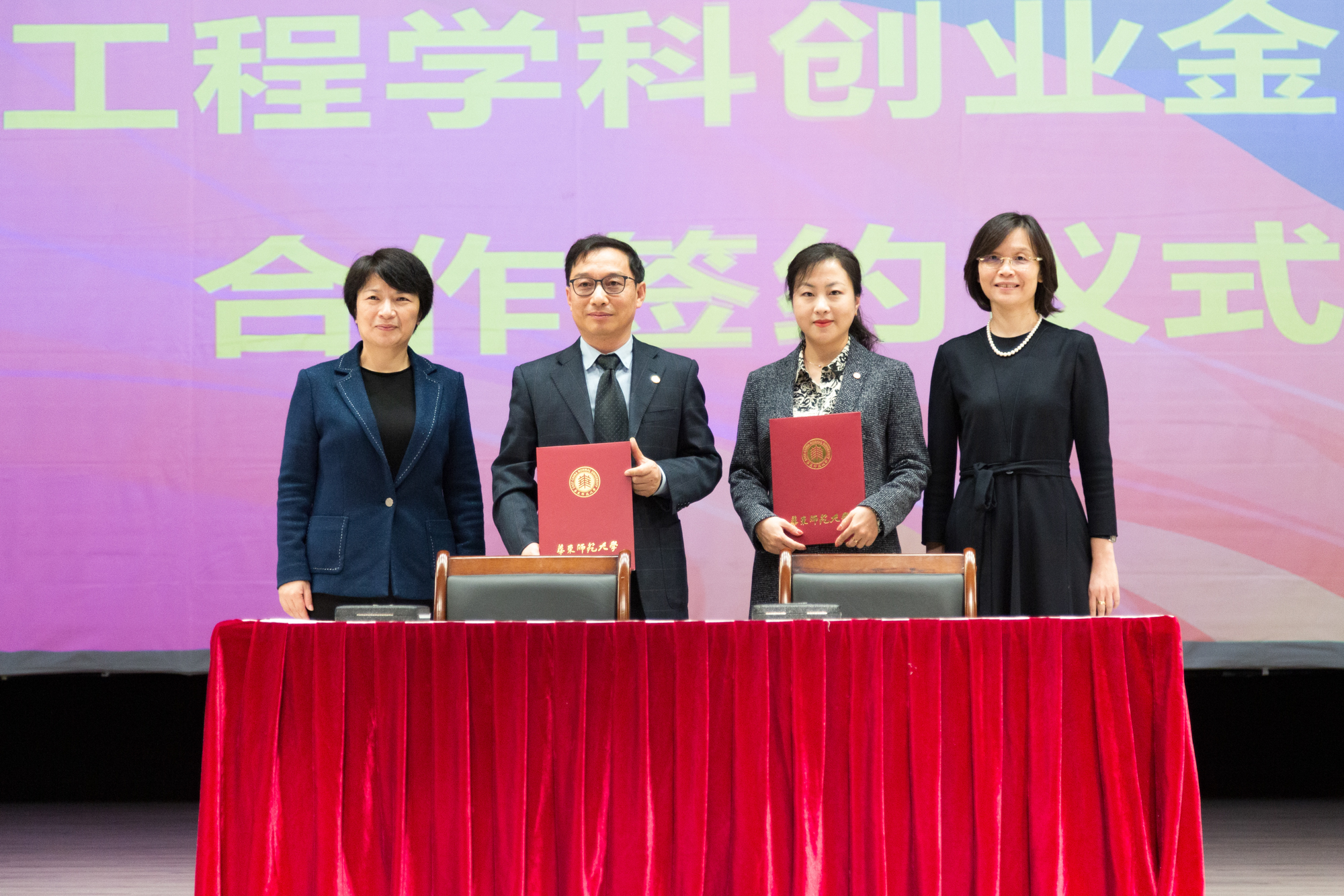 在华东师大党委书记梅兵和中国银行上海市分行正局级副行长项晞的见证下,华东师大教育发展基金会秘书长、校友工作办公室主任、软件工程学院党委书记斯阳和中国银行上海市分行副局级资深合规专家刘英红签约。