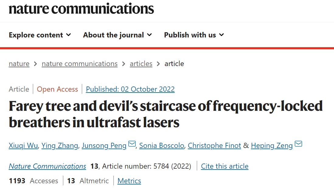 近日,华东师大精密光谱科学与技术国家重点实验室曾和平教授团队首次在理论和实验中观察到了呼吸子激光中存在法里树和魔鬼阶梯的层次结构,揭示了呼吸子超快激光器中的分形动力学。相关研究成果以“Farey tree and devil’s staircase of frequency-locked breathers in ultrafast lasers”为题于2022年10月2日发表于Nature Communications。