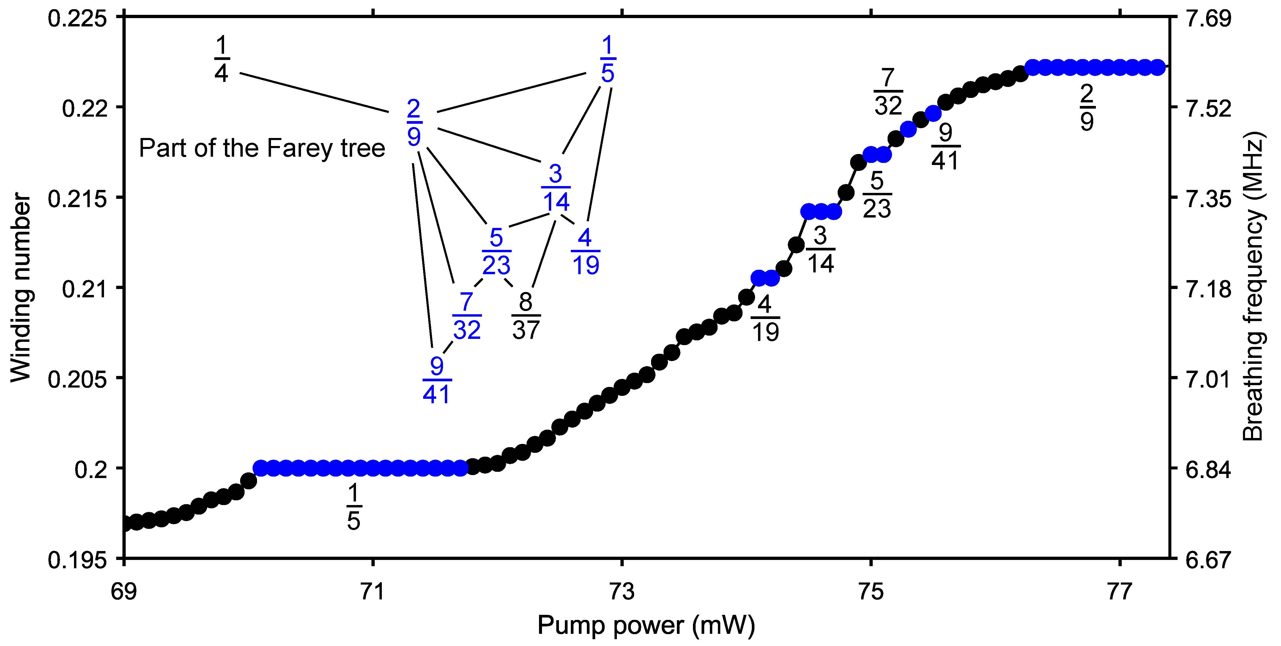 此外,团队还发现呼吸频率(呼吸子演化周期的倒数)与激光器重复频率(由激光器长度决定)的比值(即:环绕数),随着泵浦电流的变化会出现如蓝色阶梯的一系列平台(图2)。平台对应的环绕数非常稳定,不随泵浦电流变化。这些平台对应的数值展现出经典的分形结构-法里树(图2的插图)。该分形结构被称为魔鬼阶梯是因为其分形维度的值(0.87)和魔鬼阶梯一致。