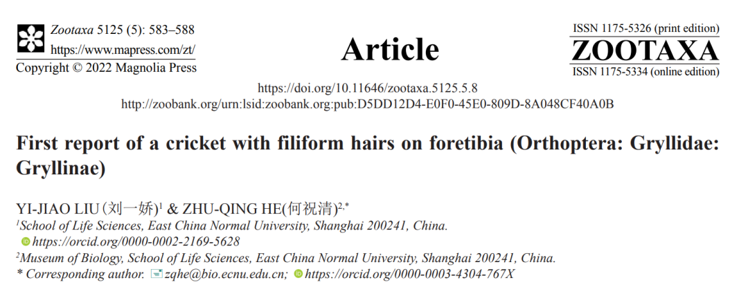 刘一娇,华东师大孟宪承书院2019级生物科学专业公费师范生,2021年度优秀学生一等奖学金获得者。主要以分类学为研究方向,已累计发表描述蟋蟀、螽斯、寄生蜂、睑虎、鞭蛛等4新属20新种。相关成果发表研究型论文17篇,其中一作SCI 6篇。相关研究成果获全国大学生生命科学竞赛国家级一等奖、二等奖、三等奖各一次。上海市生命科学竞赛一等奖、三等奖各一次。