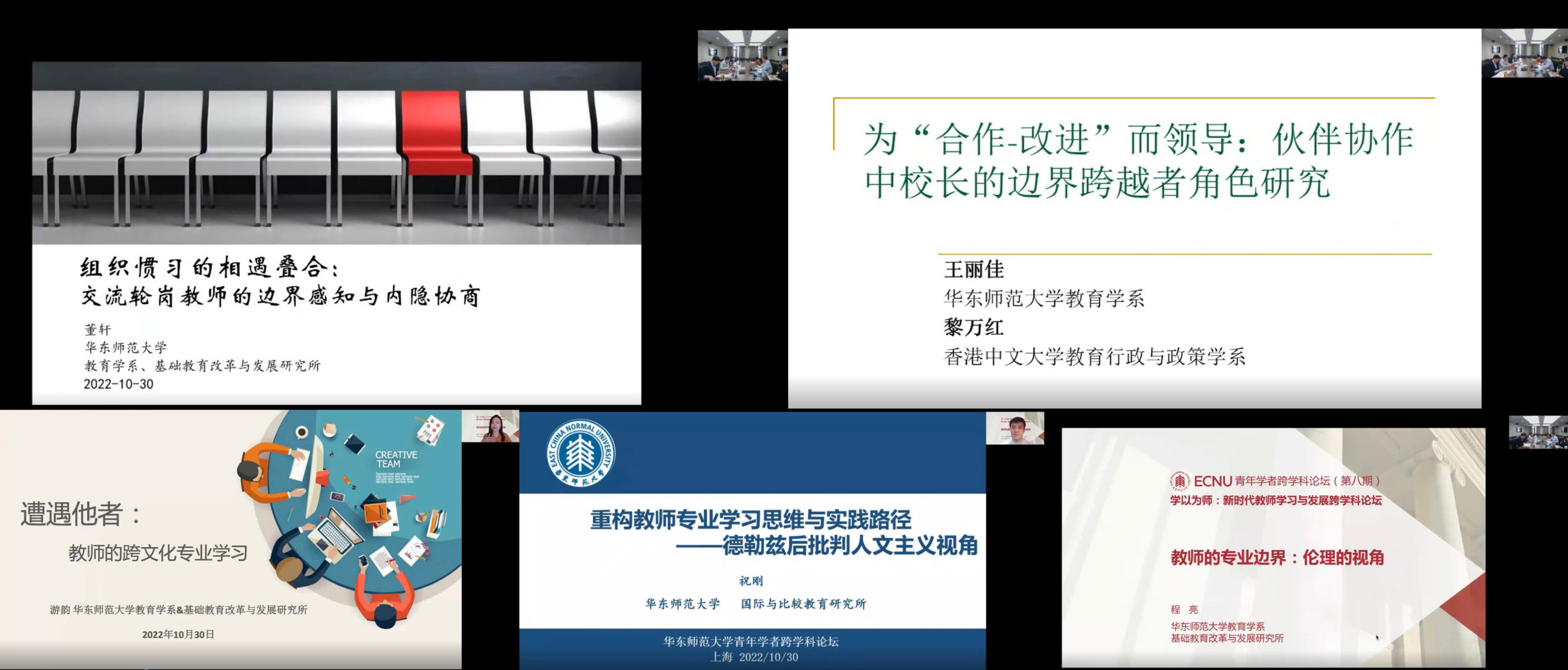 第二阶段是专题研讨环节,由华东师大杜明峰副教授主持,项目团队的五位老师进行了专题报告。董轩副教授作了题为“组织惯习的相遇叠合:交流轮岗教师的边界感知与内隐协商”的报告,力图突破“内因-外因”、“结构-能动性”二分的逻辑,借助组织惯习的中观理论,探索交流轮岗教师“边界感知”与“跨越边界”的文化动力机制。王丽佳副教授作了题为“为‘合作-改进’而领导:伙伴协作中校长的边界跨越者角色研究”的报告,认为校长在伙伴协作中应关注学校作为学习单元的组织学习,创设有助于组织知识生产的共享空间,并在此过程中坚守教育知识的创生。游韵副教授做了题为“遭遇他者:教师的跨文化专业学习”的报告,认为跨越文化边界体现了一种“对自身文化的相对化”,跨文化教师的居间身份带来了新的专业成长的可能,但既有研究更重视非西方国家的教师进入西方文化的单向过程。祝刚副教授做了题为“重构教师专业学习思维与实践路径”的报告,认为德勒兹的“块茎”理论与“线喻”理论等,可以超越传统教师专业学习思维与模式,将教师实践中的“过程-结果”线性论、二元论转换为复杂论、生成论与差异论,为创新教师学习带来可能。程亮教授作了题为“教师的专业边界:伦理的视角”的报告,主要聚焦师生之间的关系或互动,分析了公共-私人、人际-专业关系、个人-专业领域等边界上的伦理问题,讨论了教师如何维持边界上的伦理平衡问题。