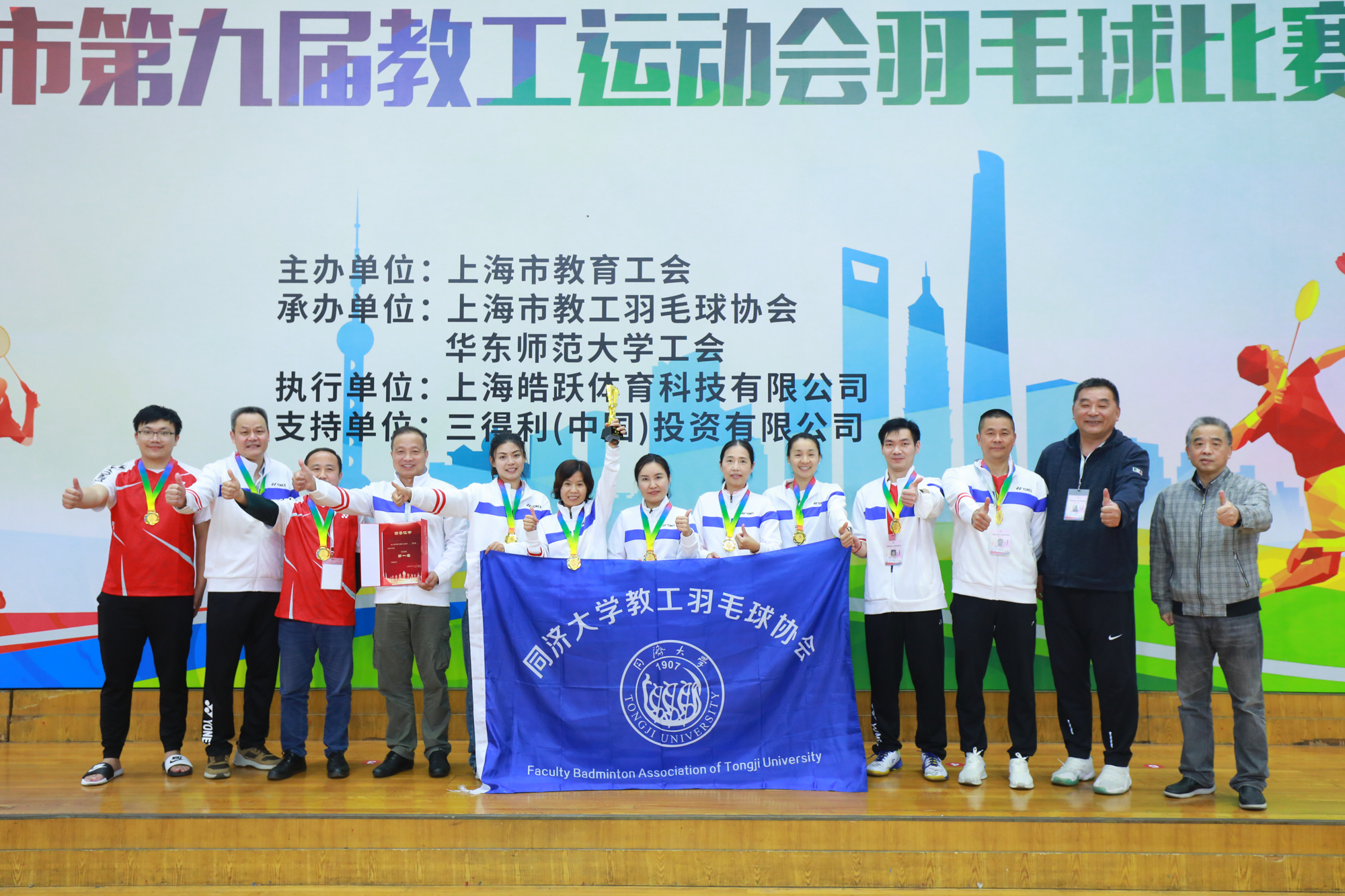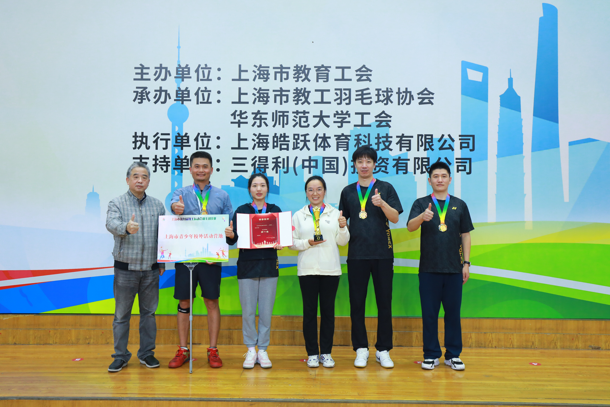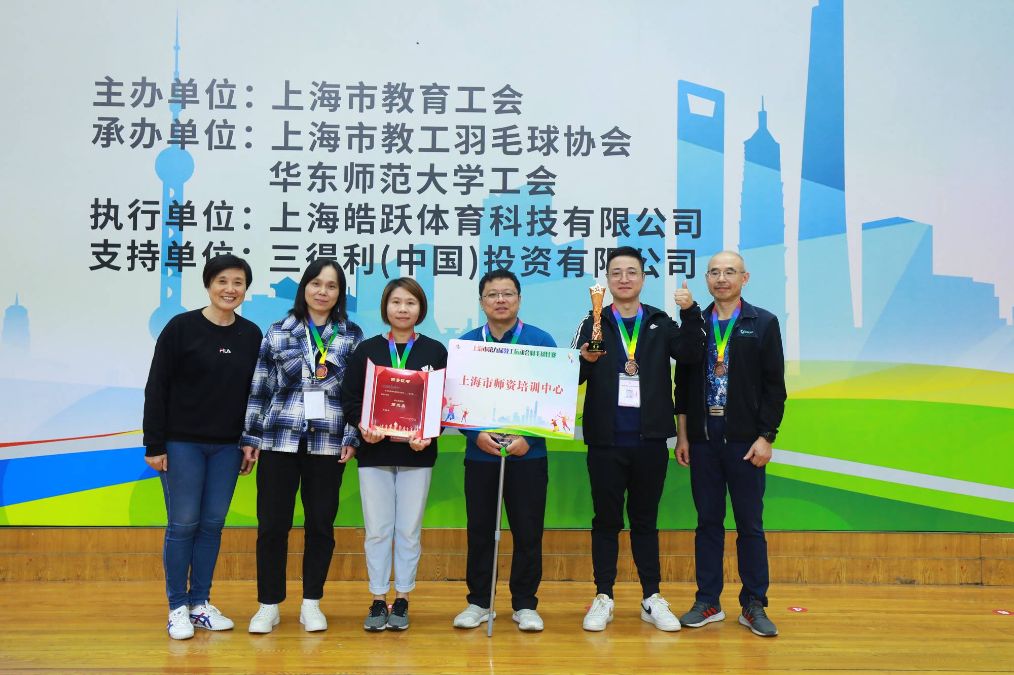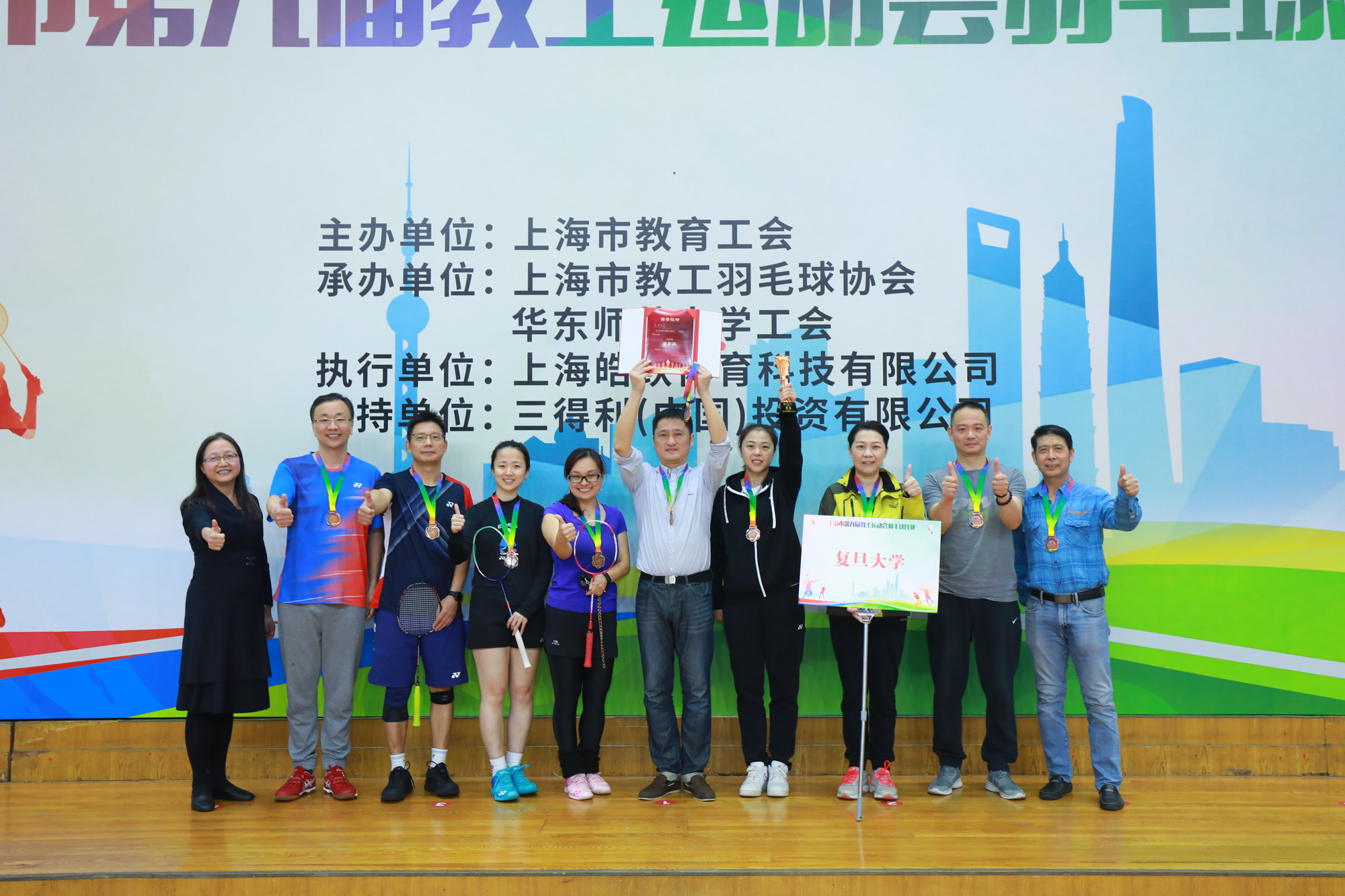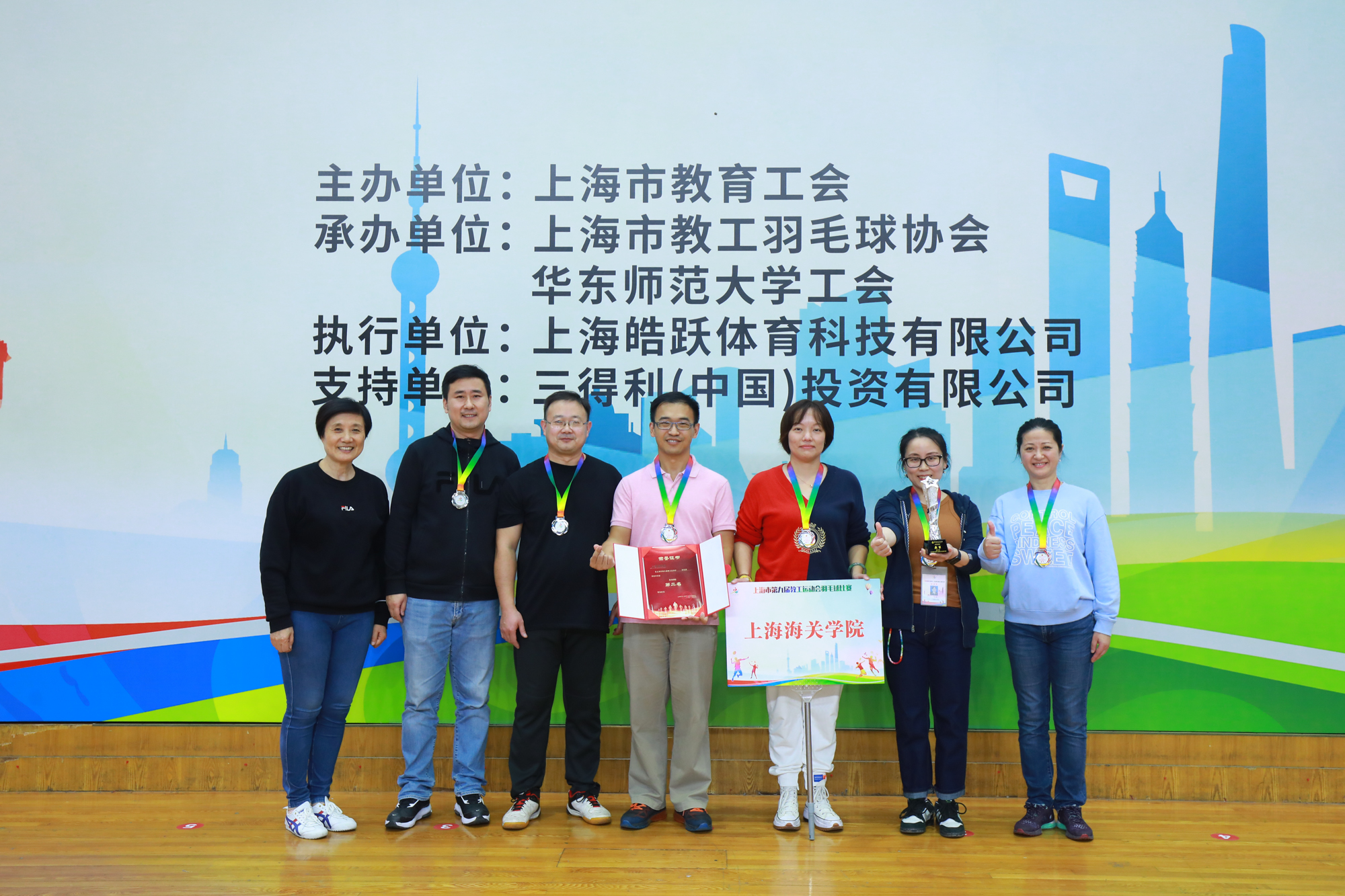 经过近六个小时的激烈角逐,上海市第九届教工运动会羽毛球比赛各个奖项终于“名花有主”:同济大学、上海大学、复旦大学获高校A组冠、亚、季军;上海商学院、上海海关学院、上海戏剧学院获高校B组冠、亚、季军;松江区、静安区、普陀区获普教组冠、亚、季军;上海市青少年校外活动营地、上海市高校科技发展中心、上海市师资培训中心获直属组冠、亚、季军。