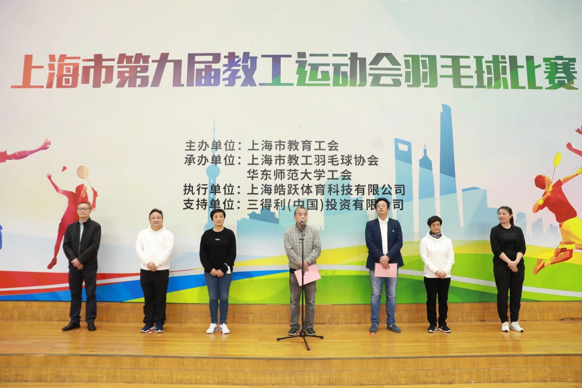 上海市教育工会副主席陶文捷在致辞中,代表上海市教育工会对各高校、区县及直属机关教育工会积极组队参赛表示欢迎,对市教工羽毛球协会和华东师大工会为比赛顺利进行所做的大量筹备工作表示感谢。希望大家积极响应习近平总书记提出的“健康是幸福生活最重要的指标”的号召,以饱满的精神、健康的体魄投身教育事业,为全面建成社会主义现代化强国、实现中华民族伟大复兴作出新的更大的贡献。最后,他祝愿本次羽毛球比赛圆满成功,并宣布上海市第九届教工运动会羽毛球比赛正式开始。