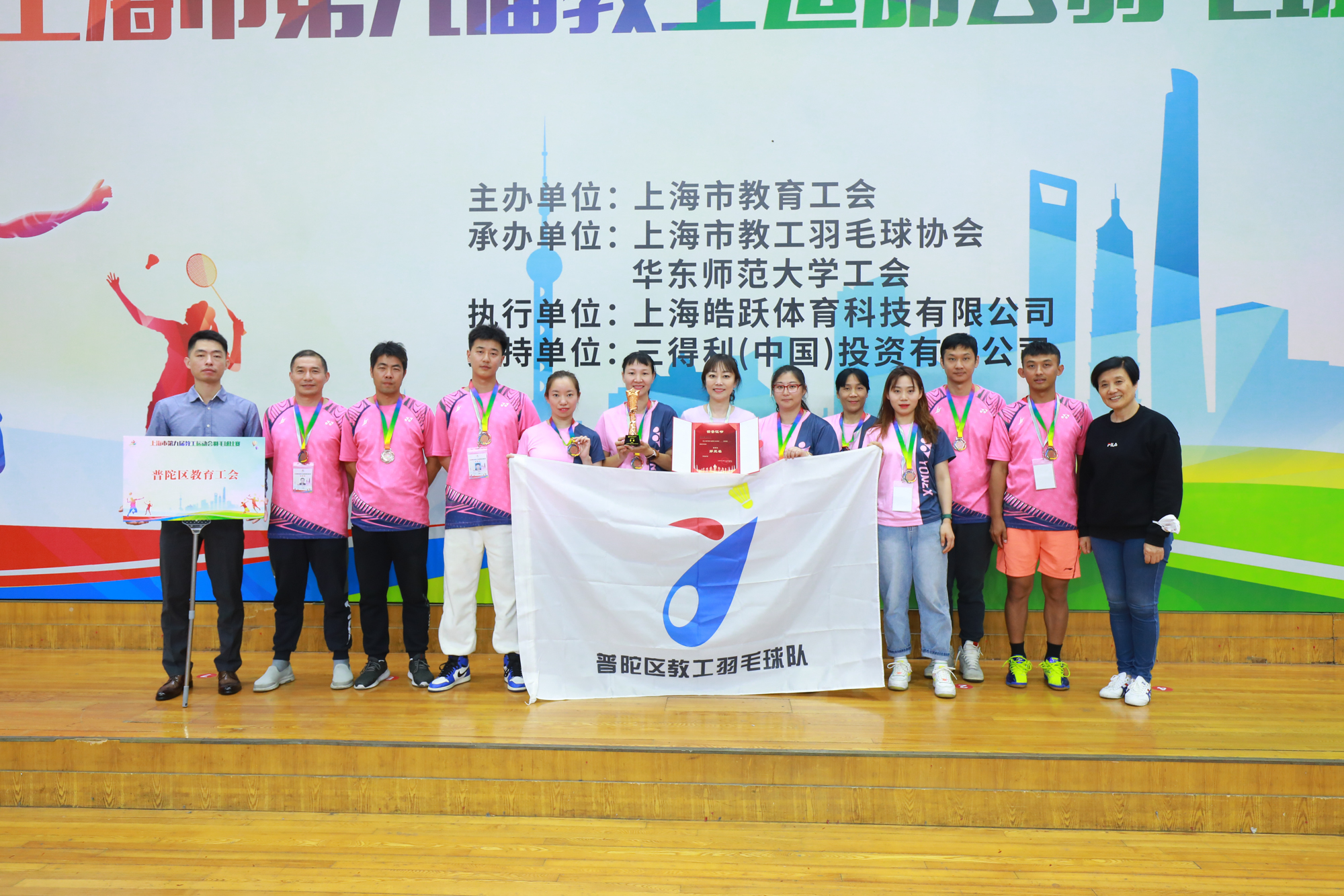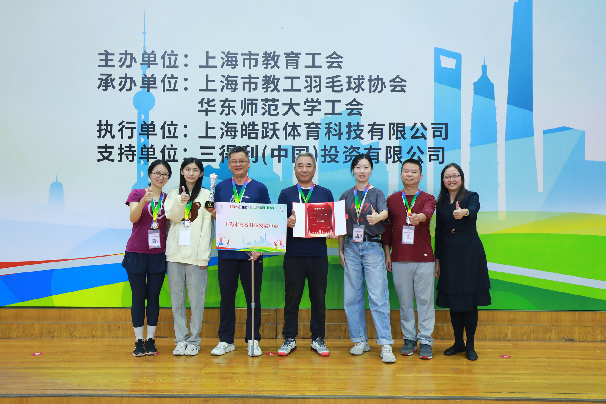 在颁奖仪式上,上海市教育工会副主席陶文捷,上海教工羽毛球协会会长、华东师大工会常务副主席王平,上海市教育工会宣教文体部顾问顾红以及到场的组委会成员、部分高校、区教育工会主席等共同为各组别的冠、亚、季军以及第四至第八名的获奖团队颁奖。