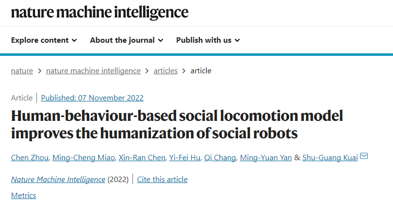 华东师大蒯曙光教授团队利用虚拟现实结合计算建模的方法巧妙地对人类社会行走行为进行了量化,并进一步设计了基于人类行为特性的算法,显著提升了机器人的拟人性以及人机交互体验,有效解决了机器人融入社会场景中的问题,构建了人类行为理论和导航算法之间的联系,实现了人类社会行走理论从概念、模型到算法的跨越。这项横跨人文、科学和工程的交叉科学研究成果在国际顶尖计算机科学期刊《自然 · 机器智能》(Nature Machine Intelligence)上发表。