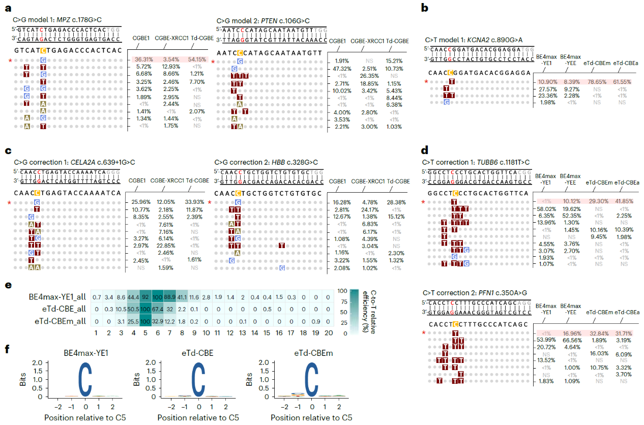 Td-CGBE高精确度的特性为进一步开发精准的C到T的碱基编辑器奠定基础,项目组通过对TadA-8e结构中可能与底物相互作用的关键区段重新改造、linker序列以及UGI串联等多轮优化获得了一系列Td-CBEs,发现其依然表现为完全消除腺嘌呤编辑的特性,其中TadA-8e引入关键突变E27R获得的Td-CBEmax,在13个靶点测试后发现,其保留高效的C到T编辑活性,产生与BE4max相似的编辑活性(57.7%-94.9%),但编辑窗口显著缩小到sgRNA的5-7位,而且产生显著降低的indels频率。为了解决传统CBE的精准性问题,该研究发现在Td-CBE的基础上去除linker序列并在TadA-8e-N46L的基础上引入P29A(eTd-CBEa)或A48M(eTd-CBEm)可保留较高的C到T编辑活性,并且显著缩小编辑窗口到sgRNA的第5或第6位,与基于APOBEC1来源的窄窗口BE4max-YEE相比,eTd-CBEs变体的精确度最高提升了131.4倍,且仅诱导背景水平的indels事件(图2)。