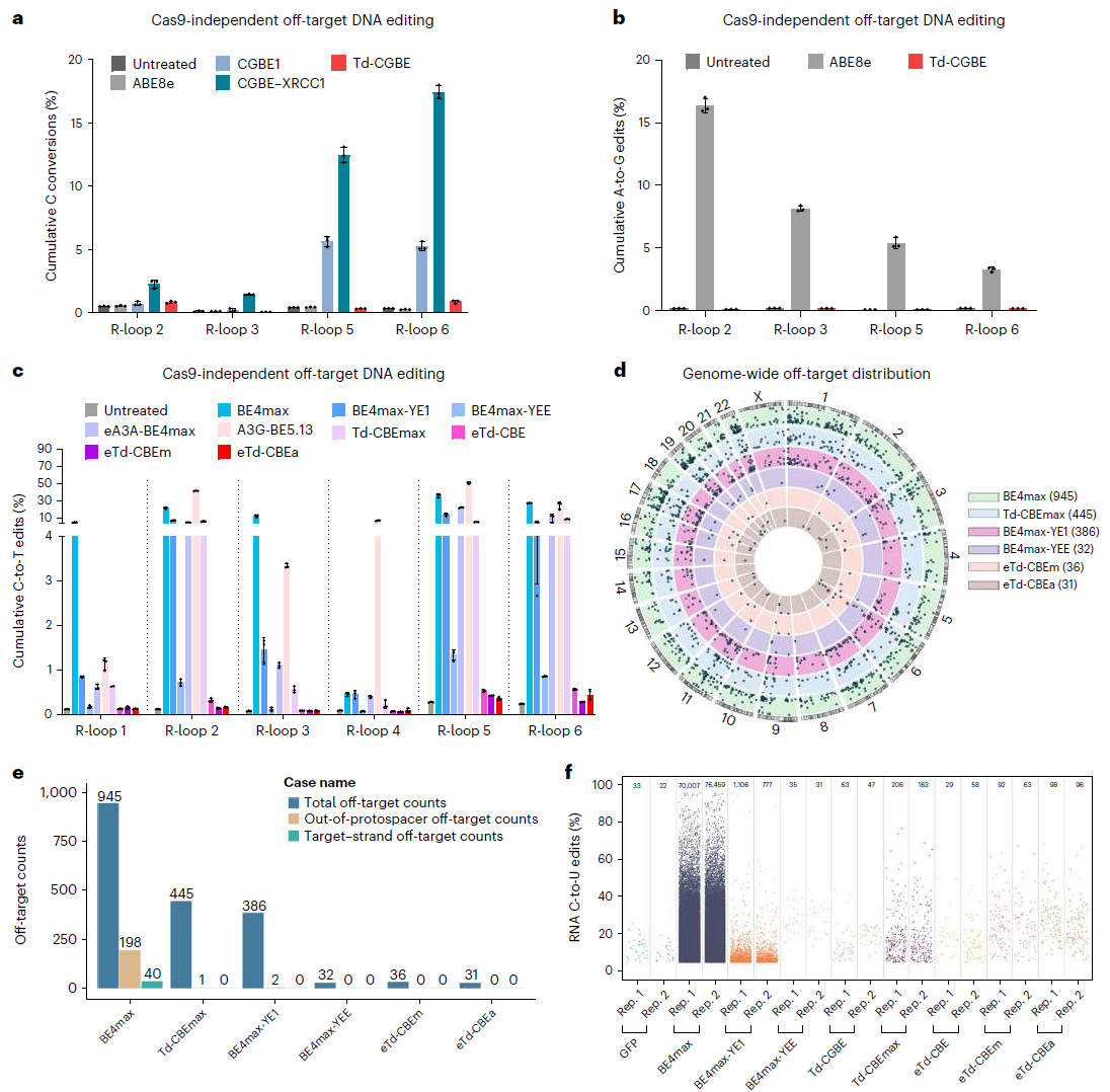 图4:Td-BEs变体纠正人类致病性的SNVs及靶向文库分析无偏见的评价eTd-CBEs编辑特性