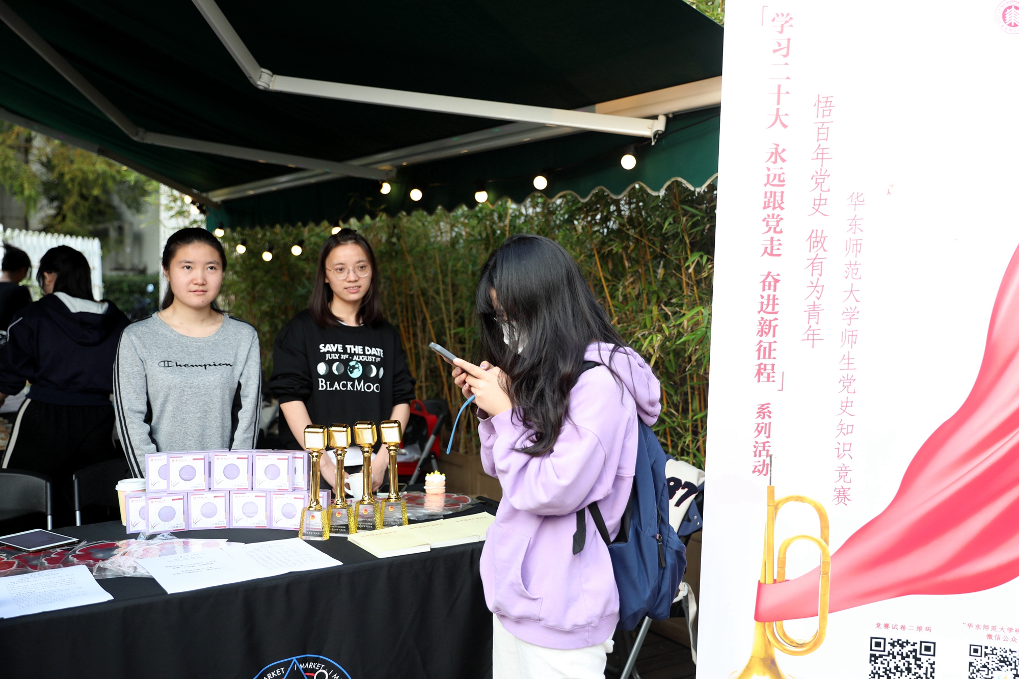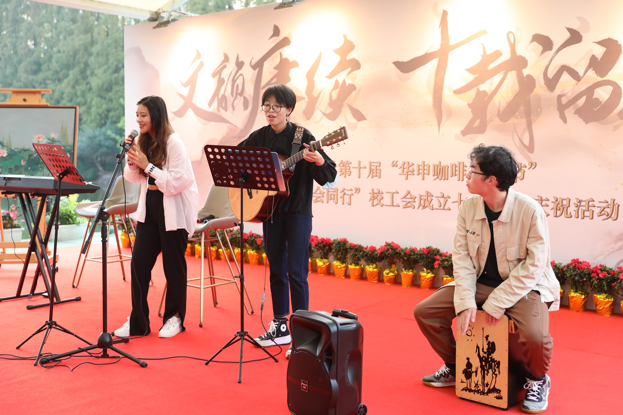 古色古香的民俗小玩意儿、动听悦耳的流行音乐、精美绝伦的花艺篆刻、香气扑鼻的咖啡饮品、火热的党史知识热身赛……11月10日下午,一年一度的“华申咖啡文化节”在金秋的华东师大校园如约而至,迎来十岁生日。正逢华东师大工会成立70周年,庆祝活动同期举行。