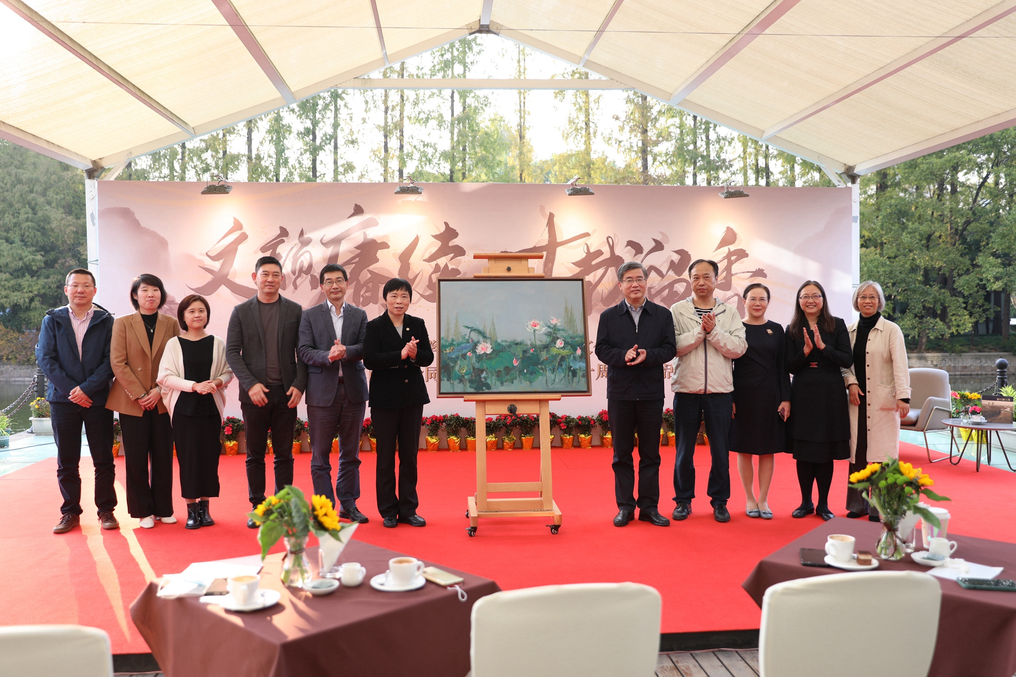 这幅油画是美术学院的学生为本次活动特别创作的作品,作品中有三秋桂子、十里荷花,凝视着丽娃荷塘,仿佛能看见代代华东师大人为学似荷、育人若水之风范。