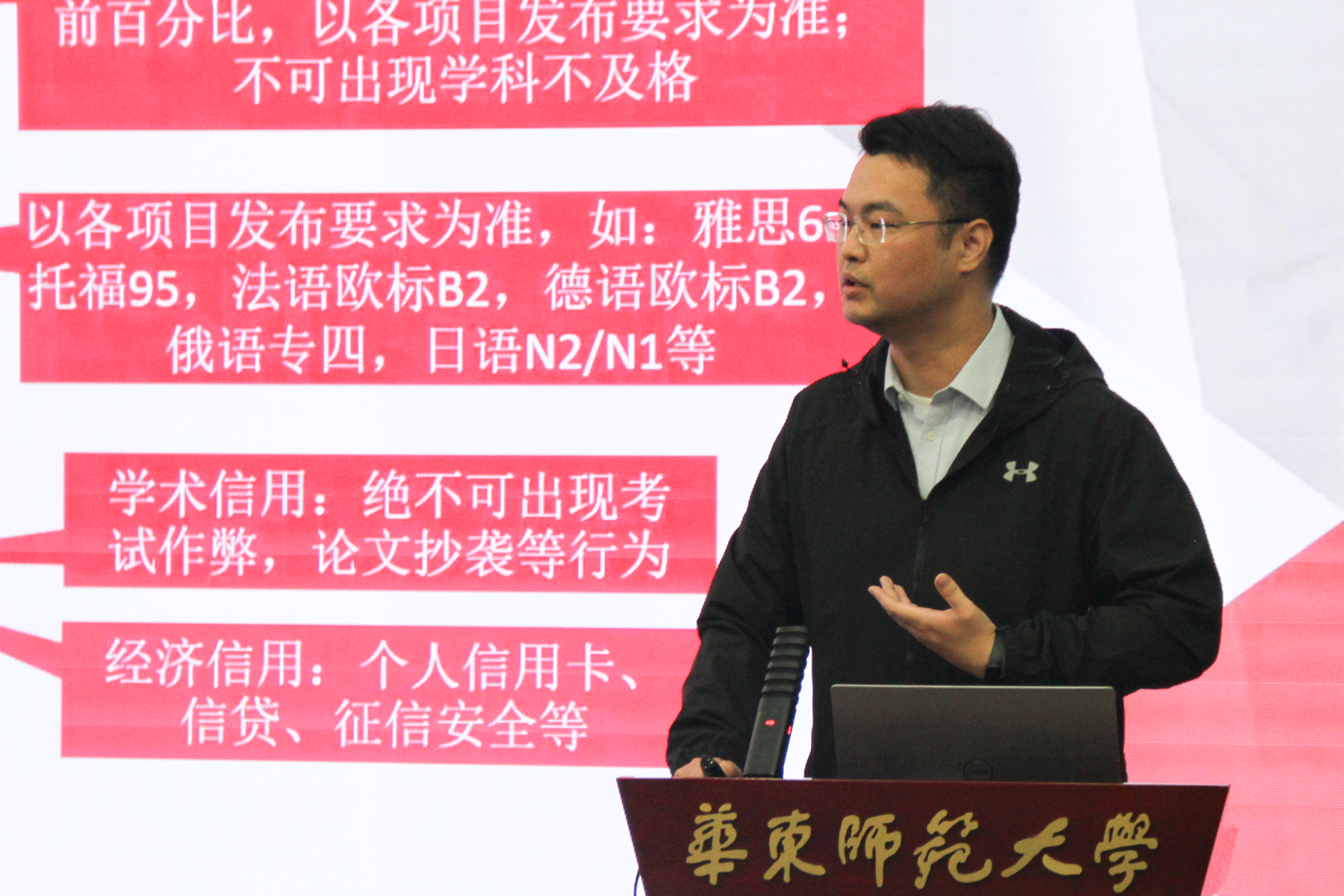 11月16日,由教育部国际合作与交流司主办、教育部留学服务中心承办、华东师大协办的“平安留学·卓观天下”学生出国境预备营系列首场活动在普陀校区孟刘馆二楼报告厅举行。该活动以线上、线下相结合的方式进行,200余名师生共同参与。