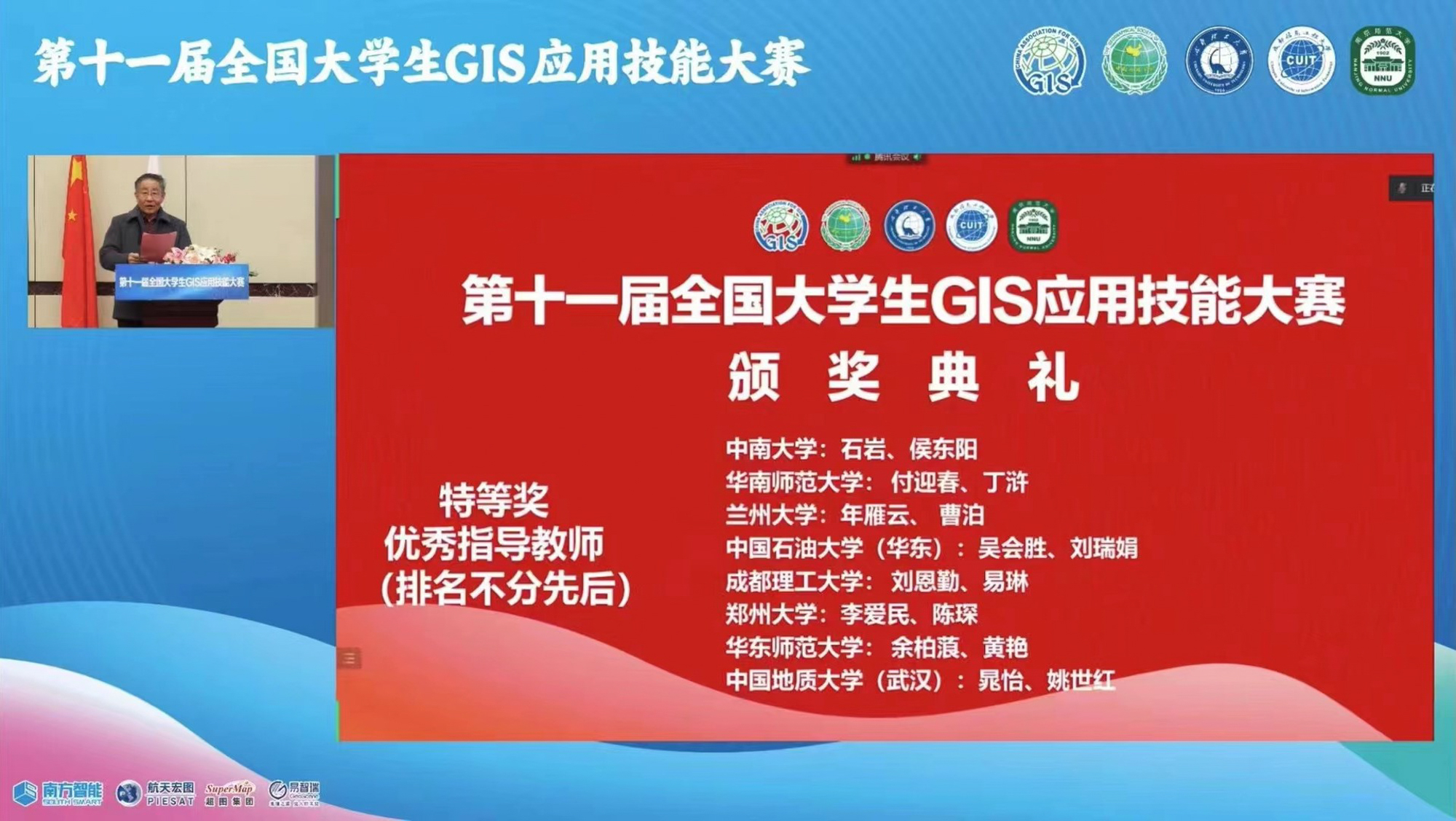 11月18日-20日,由中国地理信息产业协会、中国地理学会主办的“第十一届全国大学生GIS应用技能大赛”在成都理工大学举行,共有来自全国各高校共180支队伍参赛,经过激烈角逐,由3245澳门新莆京地理科学学院2020级本科生祁宁宁、赵博旸、陈秀静、杨宗翰组成的参赛团队斩获特等奖,余柏蒗、黄艳获优秀指导教师奖,这是3245澳门新莆京连续第三年斩获全国大学生GIS应用技能大赛特等奖。