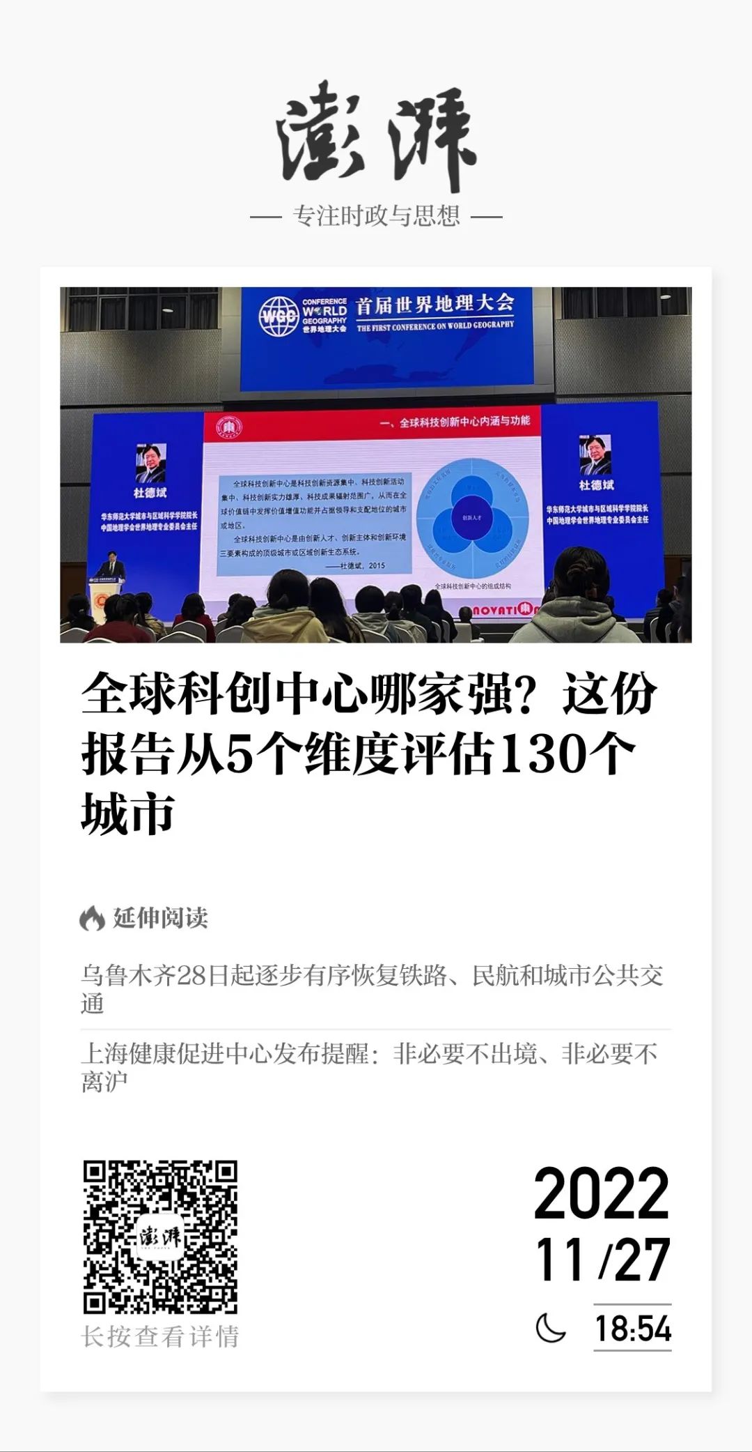 首届世界地理大会在沪举行 全球科创中心发展指数发布