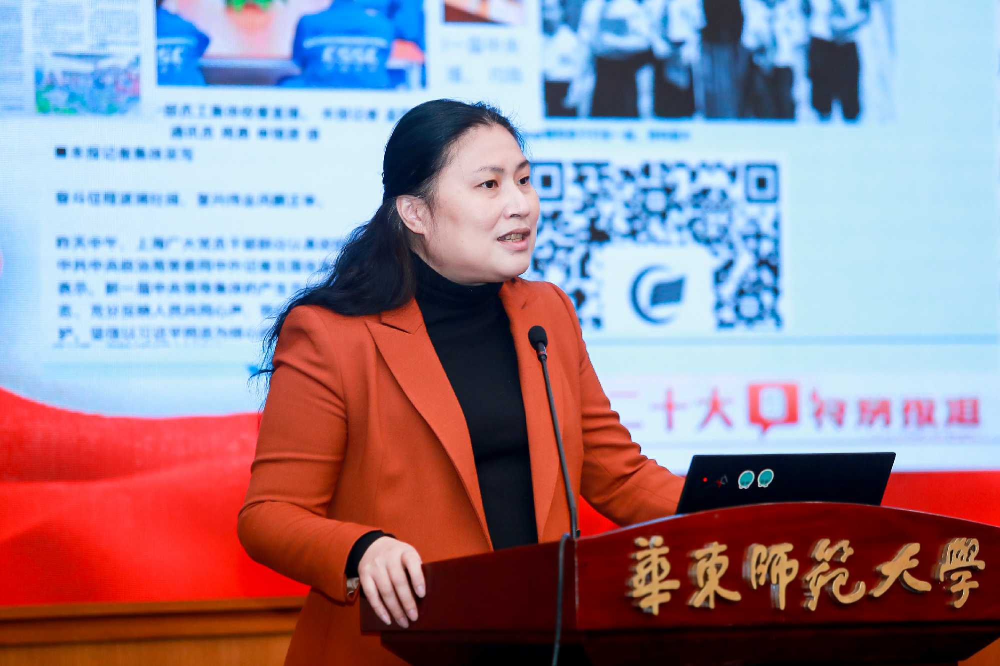 二十大代表、全国三八红旗手标兵、黄浦区卢湾一中心小学校长吴蓉瑾亲历并全程参与了党的二十大,她以“我与教育发展”为主题,带大家回顾了在党的带领下,我们的祖国在过去五年和新时代十年中所取得的伟大变革,这也坚定了我们教育工作者建设社会主义人才强国、教育强国的信心。她指出学习贯彻好党的二十大精神,一要坚持红色教育,涵养家国情怀,传承红色基因;二要实施情感教育,关注学生需求,培养健康情感;三要深入研究紧紧围绕“立德树人”根本任务的数字教育,推进数智驱动,探索五育融合,为实现第二个百年奋斗目标贡献巾帼力量。