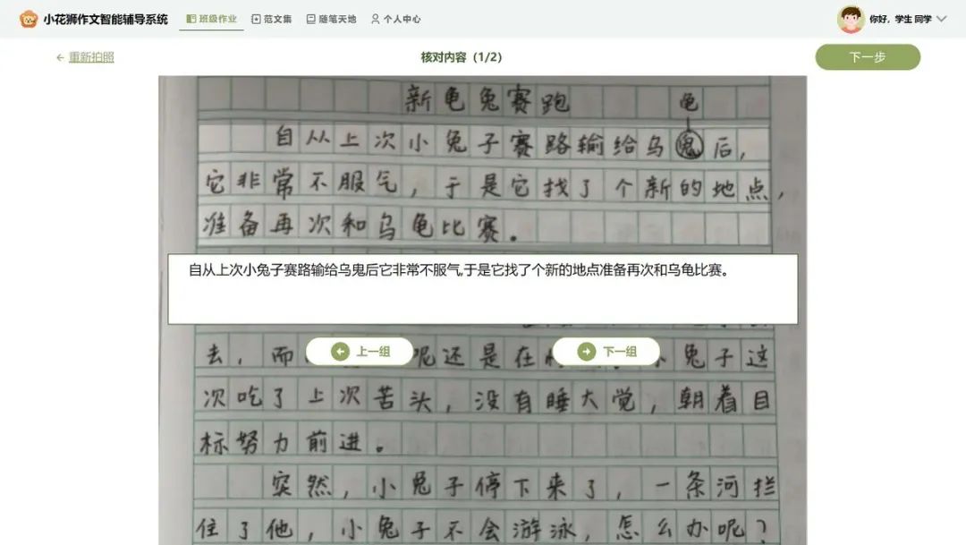 其中,光学字符识别技术就像是“小花狮”的“眼睛”,同学们拍照上传的作文照片,“小花狮”只要 “看”一遍,就能把照片中的文字信息提取出来,保存在计算机系统中。即使有些同学的字迹比较潦草,甚至有涂抹修改的痕迹,“小花狮”的这双“慧眼”也能保证识别的准确率在95%以上。