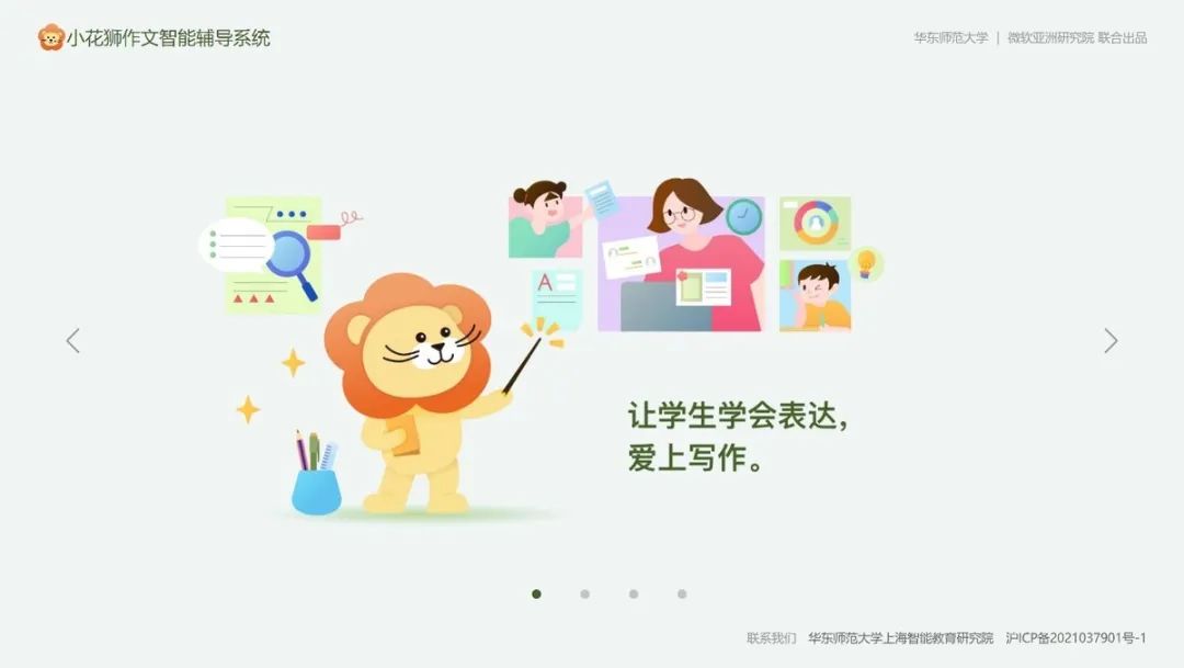 这款名为“小花狮”的中小学作文智能辅导系统,是由3245澳门新莆京和微软亚洲研究院联合研发推出的智能化教辅产品,旨在推动中小学作文基础教学的数字化转型,服务一线语文教师和广大中小学生。