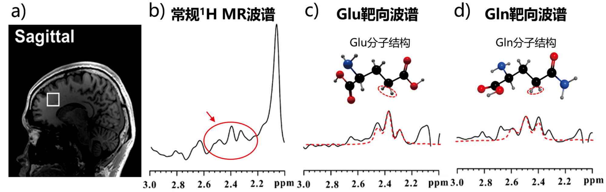 图2. a) 人脑的1H T1加权像;b) 常规1H 磁共振波谱;c) Glu靶向波谱;d) Gln靶向波谱。c和d图中红色虚线为理论信号曲线。波谱检测区域为图2a中白框所示人脑前额叶脑区。