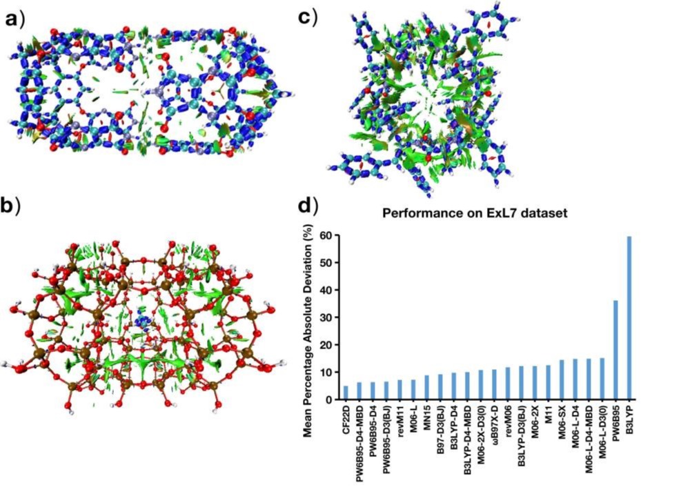 超大复合物数据集(简称ExL7)由七个原子数目从200到910的弱相互作用复合物组成。a-c)来自ExL7数据集前三个结构弱相互作用的IRI(interaction region indicator)等值面;d)常用泛函对于ExL7数据集的计算结果