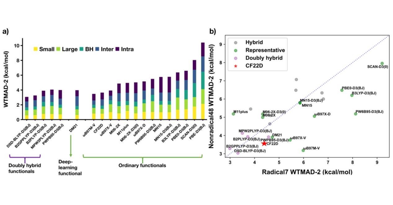 对于GMTKN55数据库的预测精度。a)不同泛函对GMTKN55数据库及其子数据库预测精度的比较;b)CF22D和其他代表性泛函在自由基与非自由基子数据库的预测精度比较