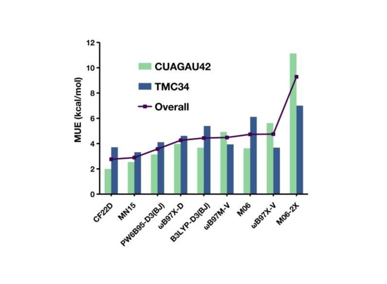 对于很多泛函来说,它们对主族元素和过渡金属体系的化学预测精度之间没有很好的相关性,对过渡金属体系的预测精度远远低于对主族元素的计算精度。因此,在开发新的密度泛函时,同时评估对这两类数据的预测准确性非常重要。CF22D不仅对主族元素计算有出色表现,同时对含过渡金属体系的预测精度也比较好。如图8所示,CF22D泛函是目前计算含过渡金属元素化学体系最准确的泛函之一。