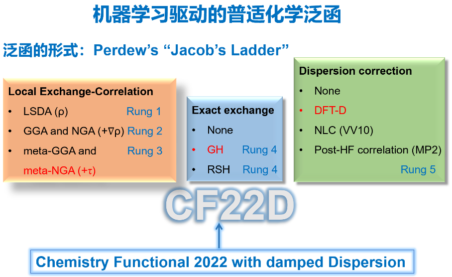 综上所述,课题组发展的CF22D泛函可广泛应用于主族元素化合物和过渡金属化合物的键合、化学性质、反应能垒和非共价相互作用等化学研究领域。同时,为凝聚态物理、材料科学、机器学习等学科领域的理论计算提供了有力工具。