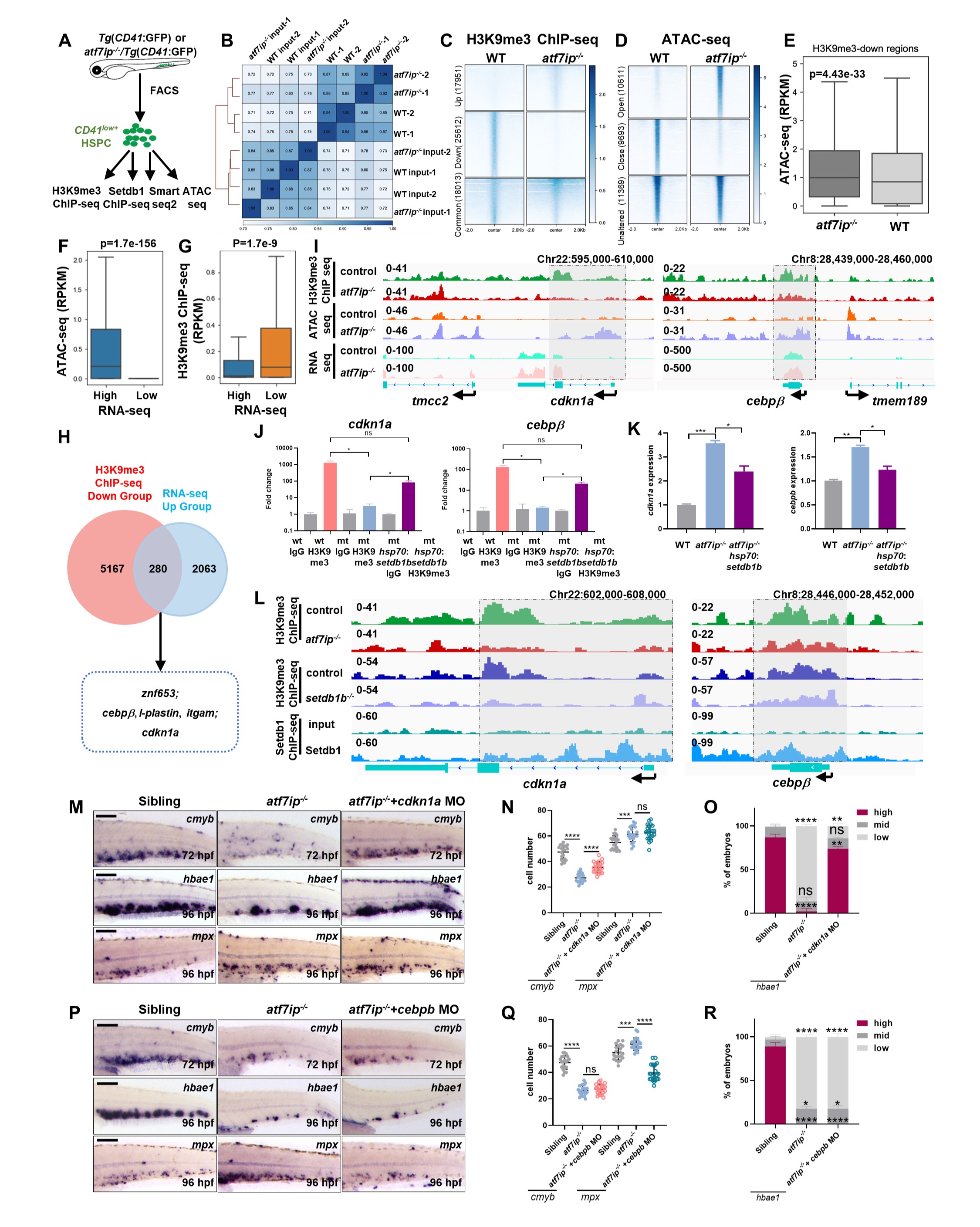 ATF7IP是一种表观调控因子,属于MCAF/AM基因家族,通过调节组蛋白甲基转移酶SETDB1核定位与泛素化,促进其H3K9甲基转移酶活性。研究人员利用CRISPR/Cas9技术构建了atf7ip和setdb1斑马鱼突变体,发现atf7ip或setdb1缺失导致造血干细胞扩增受损与髓系分化偏倚,伴随红细胞和淋巴细胞的减少。由于atf7ip和setdb1是广泛表达的表观因子,研究人员应用细胞移植、异体共生及组织特异性过表达实验,证明atf7ip/setdb1以细胞自主性方式调节造血干细胞扩增与分化。有趣的是,通过延时影像和谱系示踪技术发现,atf7ip缺失的造血干细胞在减弱增殖能力的同时提高了髓系分化潜能。通过HSPC微量ChIP-seq、ATAC-seq、RNA-seq组学分析和其他实验研究表明,敲除Atf7ip或Setdb1导致细胞周期抑制因子Cdkn1a和髓系分化关键因子Cebpb启动子区域H3K9me3沉积减少,染色质开放程度增加,引起造血干细胞扩增受阻,进而促进髓系单核细胞和中性粒细胞分化。为了进一步证明Cdkn1a和Cebpb在调控造血干细胞增殖与分化中的作用,研究人员利用吗啡啉(Morpholine)技术将Atf7ip和Setdb1突变体中的Cdkn1a和Cebpb分别敲降,结果显示Cdkn1a的缺失能部分挽救受损的造血干细胞和红系分化,而Cebpb的缺失则能抑制髓系分化偏倚。
