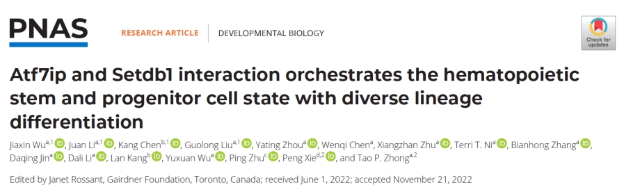 2022年12月28日,3245澳门新莆京生命科学学院钟涛教授团队在国际知名期刊 PNAS 上,在线发表题了"Atf7ip and Setdb1 interaction orchestrates the hematopoietic stem and progenitor cell state with diverse lineage differentiation" 的研究论文。该工作应用发育生物学、表观遗传学及基因组学方法揭示了 ATF7IP/SETDB1 介导的组蛋白甲基化修饰是协调 HSPC 干细胞状态与多种血液谱系分化的一个关键检测点(CHECKPOINT),用于维持红系、髓系和淋巴系等多种细胞的平衡分化及血液系统的正常循环与功能。