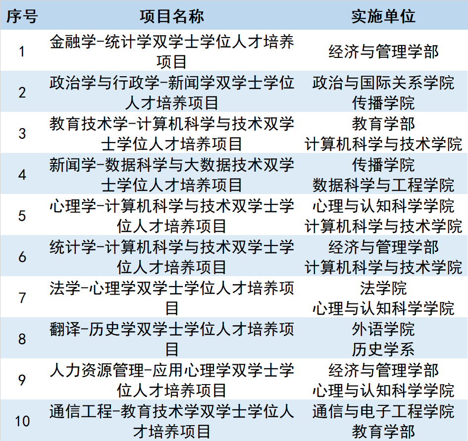 新增3个上海市普通高等学校双学士学位复合型人才培养项目,总项目数量10个,为学生全面而个性的发展提供更多选择。