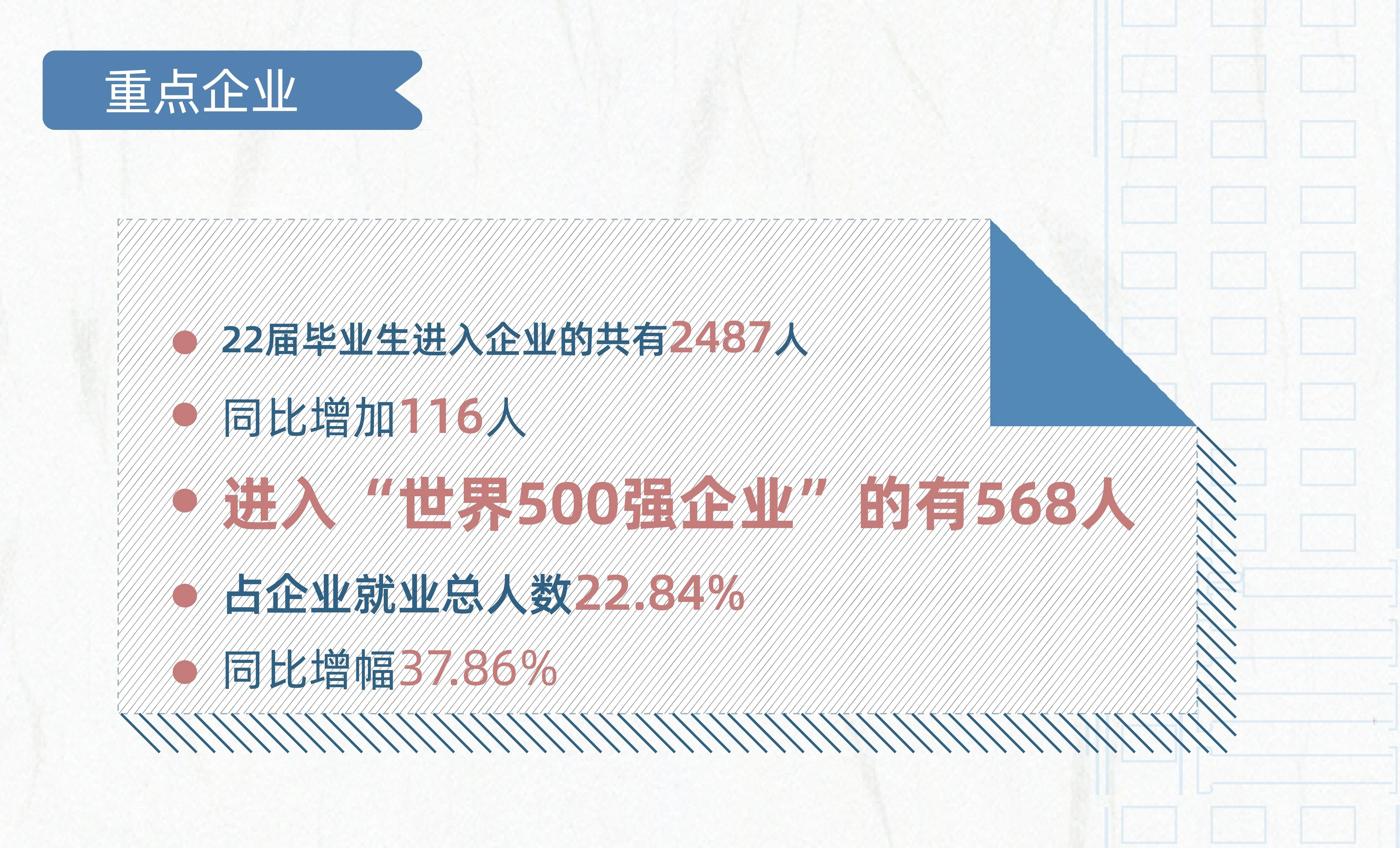 进入世界500强企业占企业就职总人数的22.84%,同比增幅近四成。