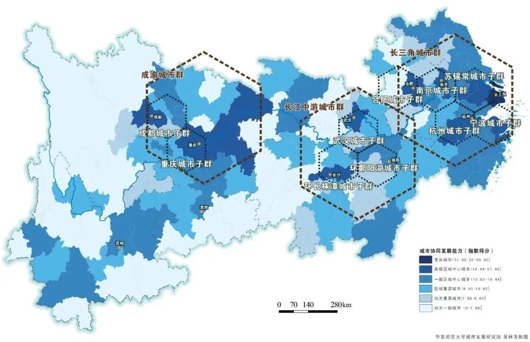 长江经济带城市协同发展能力指数分布图2022