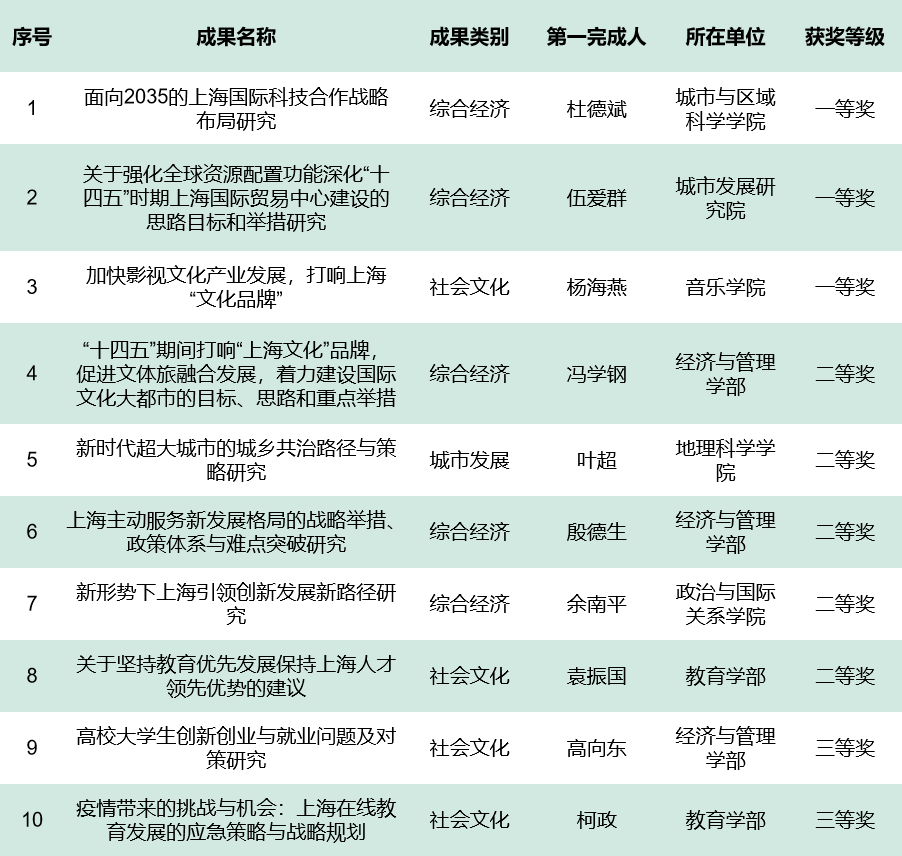 10项成果获上海市第十三届决策咨询优秀成果奖,获奖总数和一等奖均位列上海第2,为我校历届获奖数最高。