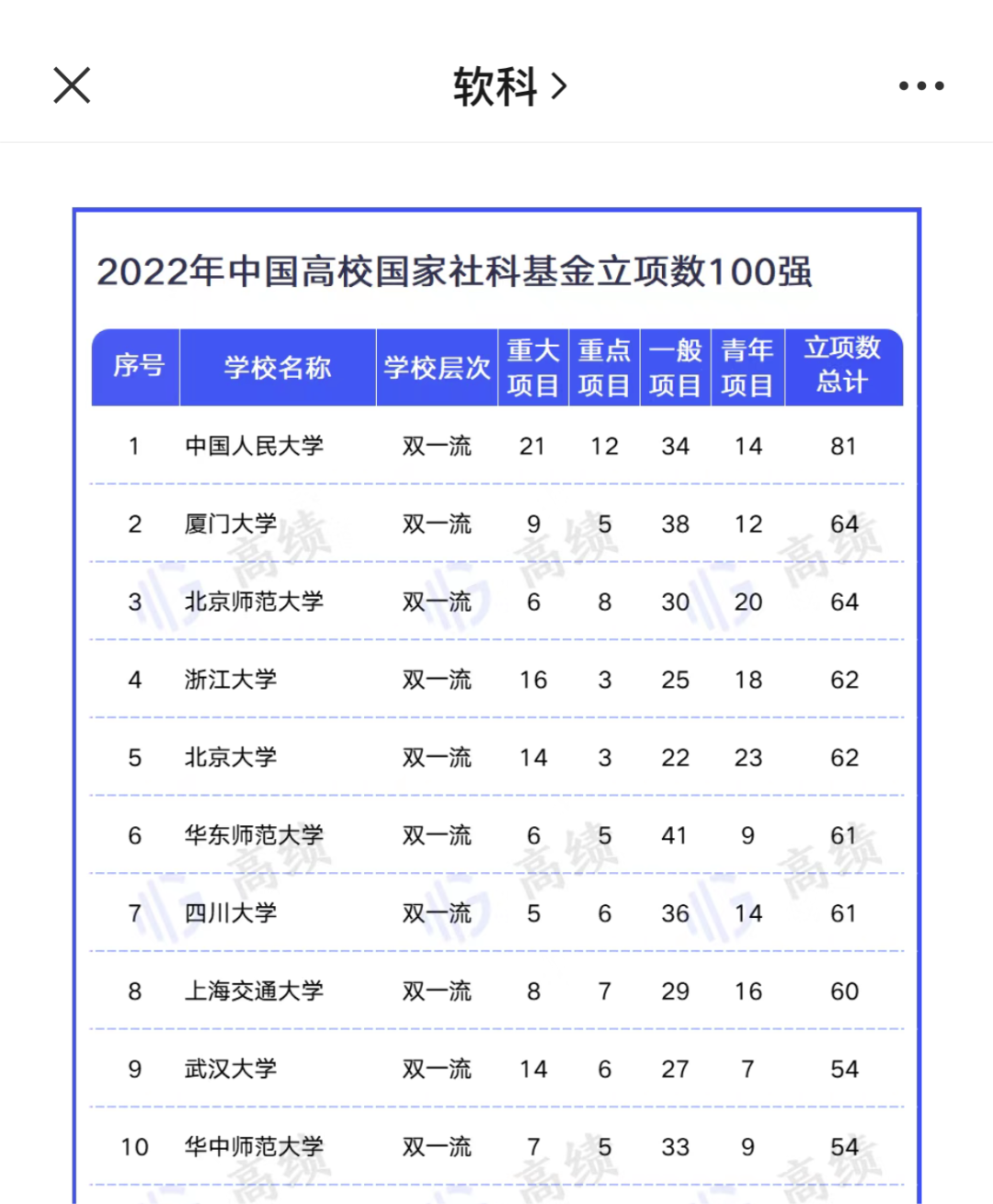 软科统计2022年中国高校国家社科基金立项数前十高校