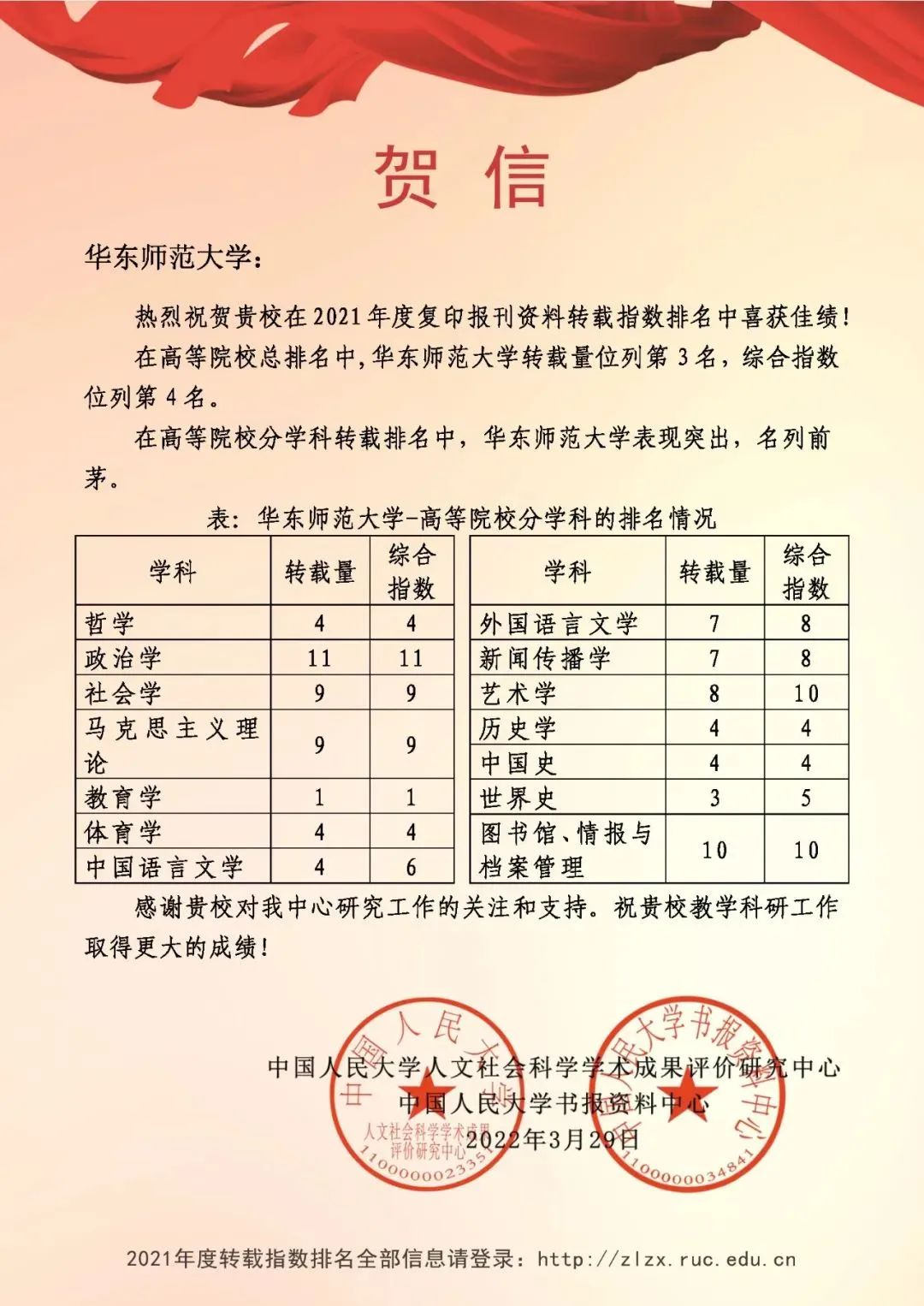 根据2022年3月发布的中国人民大学复印报刊资料转载指数排名(2021年度),我校综合指数位列全国高校第4。在高等院校分学科排名中,我校“教育学”综合指数排名位列第1,“哲学、体育学、历史学、中国史”综合指数排名第4,“世界史”综合指数排名位列第5。根据南京大学中国社会科学研究评价中心统计,我校CSSCI(2021)生产力排全国机构第7。