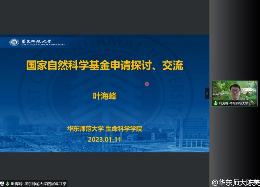 1月11日,华东师大2023年度国家自然科学基金申报动员会线上召开,校长助理施国跃出席会议并讲话。生态与环境科学学院关小红教授、生命科学学院叶海峰研究员应邀进行经验分享。科技处处长杨海波、相关负责人,各院系及附属医院分管科研领导、科研秘书、科研人员共500余人参会。会议由杨海波主持。