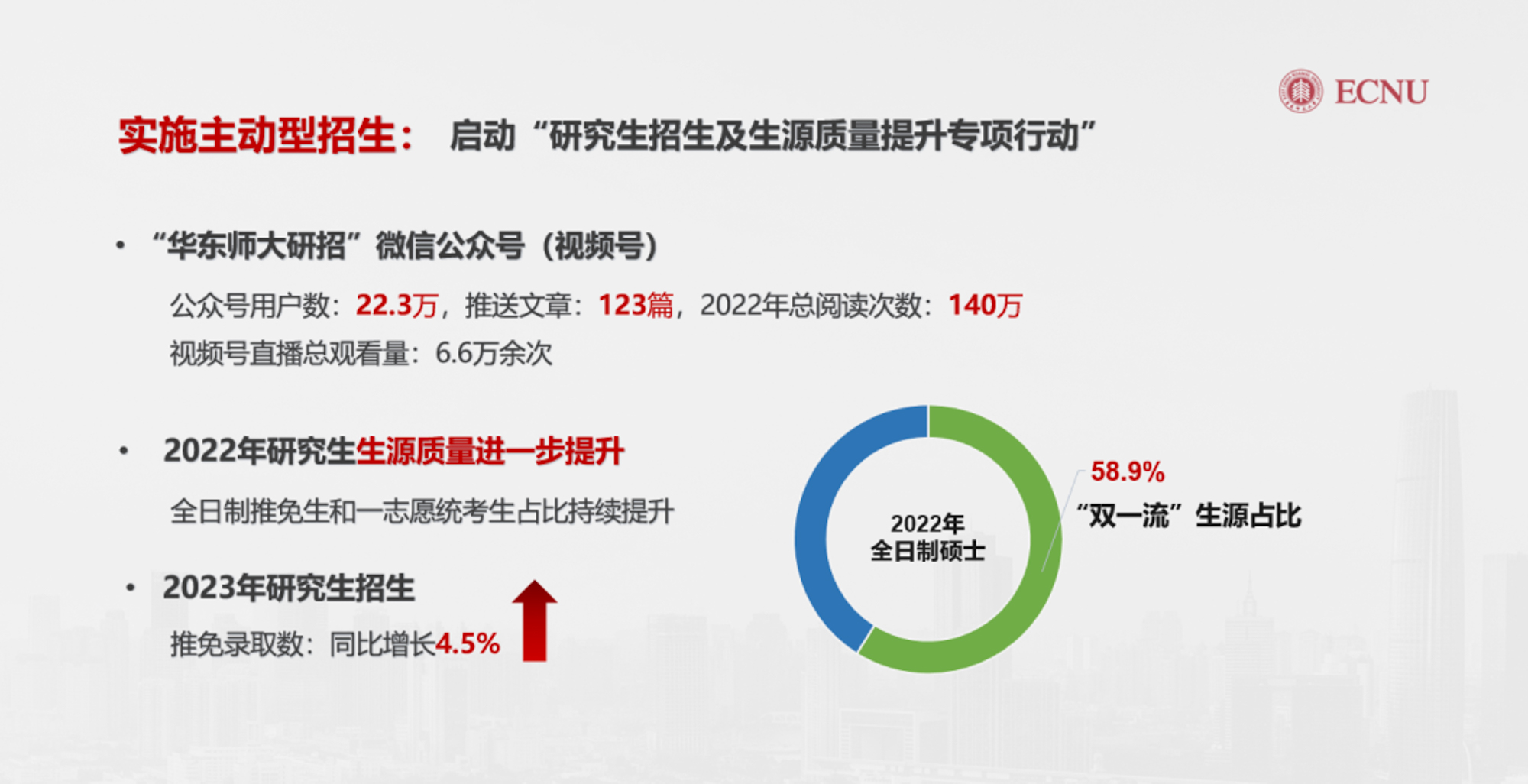 全面推进“研究生招生及生源质量提升专项行动”,2022年全日制硕士生双一流生源占比提高至58.9%;2023年拟录取推免生同比增长4.5%,其中录取直博生显著增加。