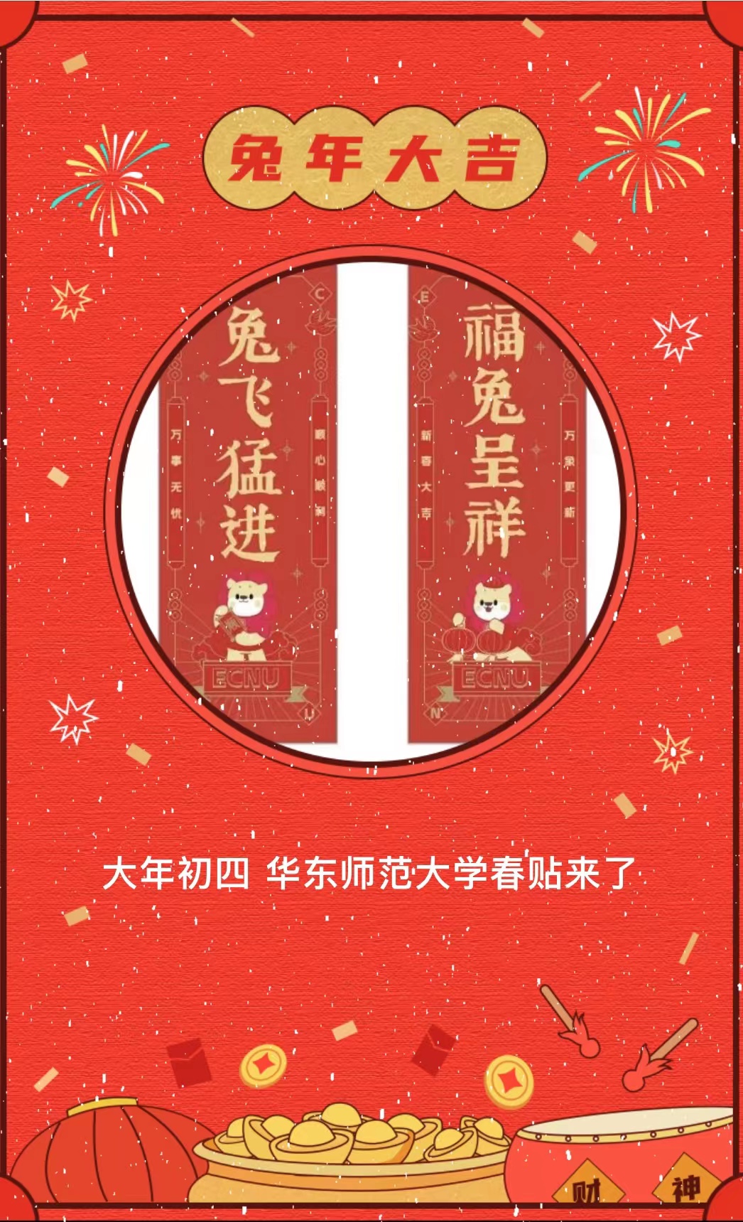 根据传统习俗,初四是迎接灶神带回吉祥安康的日子。华东师大送上吉祥春贴, 趁着新春的喜庆,守护你一年好时光。当别人还在发表情包的时候,送上春贴的你就是最靓的仔!