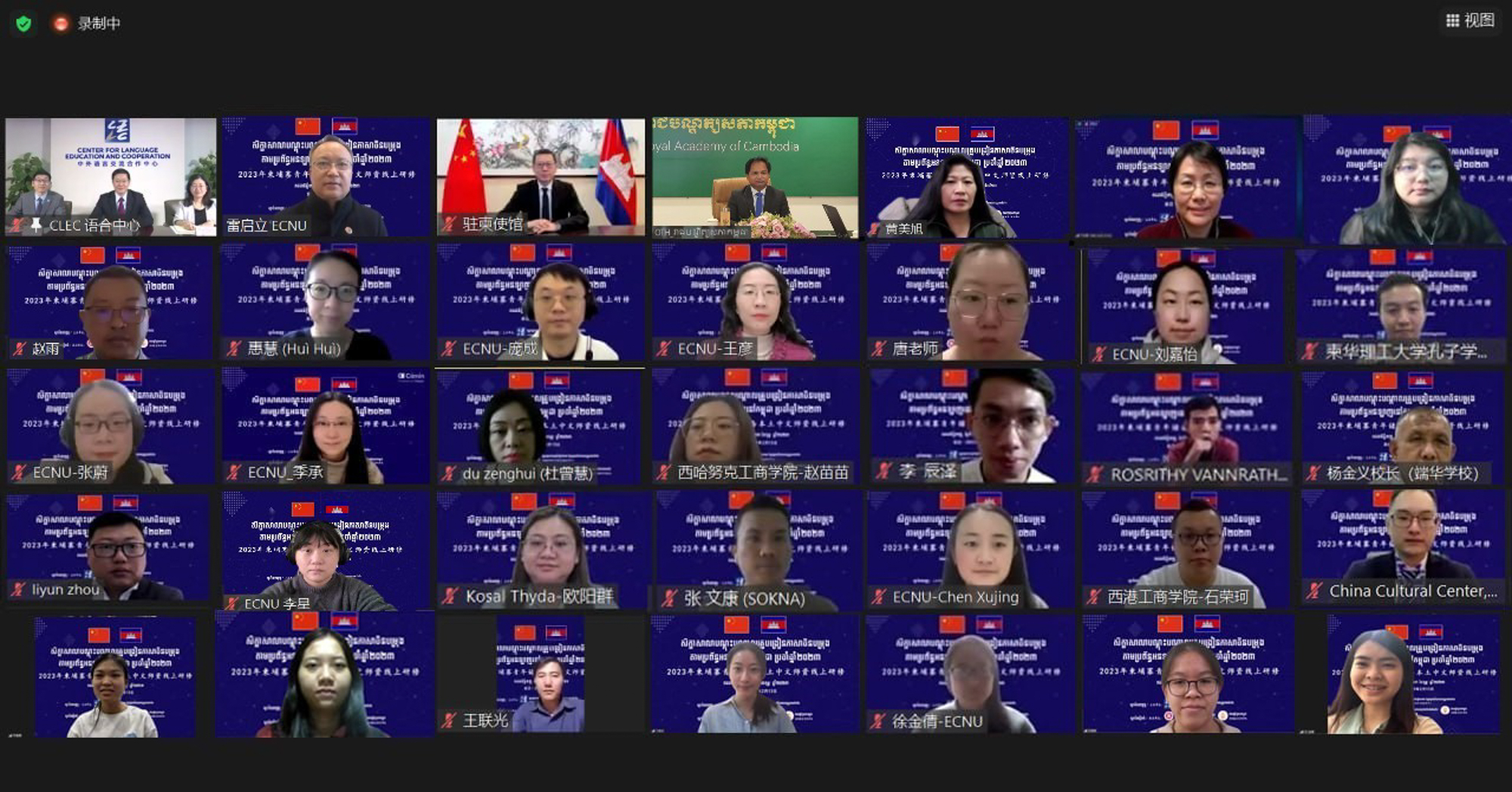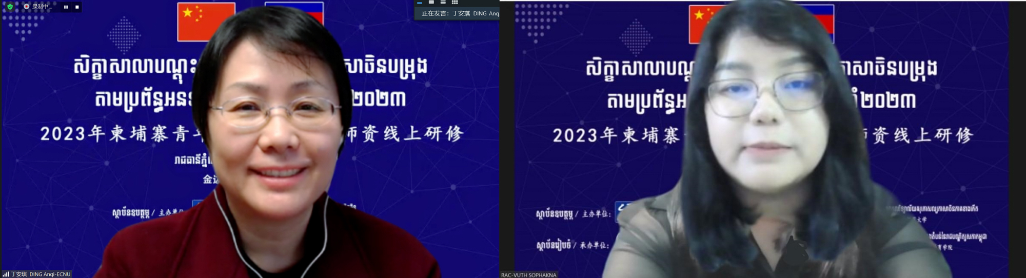 开班仪式由华东师大国际汉语文化学院副院长、国际汉语教师研修基地副主任丁安琪和柬埔寨皇家科学院国际中文教育学院院长苏碧娜共同主持。华东师大国际教育中心主任、国际汉语文化学院党委书记黄美旭,语合中心志愿者管理教师,柬华理事总会,国立马德望大学孔子学院,柬华理工大学孔子学院,金边皇家大学“DHY汉语中心”,端华学校民生学校,中华学校等柬埔寨各大中文教育机构的负责人,全柬100余名本土中文教师以及华东师大国汉基地的老师们参加了开班仪式。