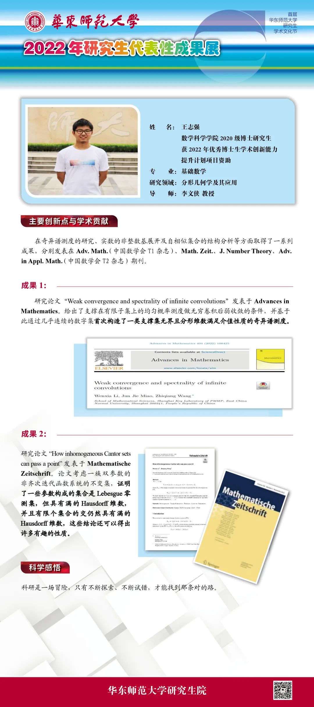王志强是华东师大数学科学学院2020级博士研究生,导师为李文侠教授,主要研究基础数学中的分形几何学。王志强的一系列成果,分别发表在Adv. Math.、Math. Zeit.、J. Number Theory、Adv. in Appl. Math. 等杂志上。学校2022年5月科技成果推送重点介绍了他与合作者发表在Adv. Math.上的论文。他先后获得2022年华东师大优秀博士生学术创新能力提升计划项目资助、2022年校长奖学金,并入选华东师大2022年“创新创业教育周”研究生成果展。