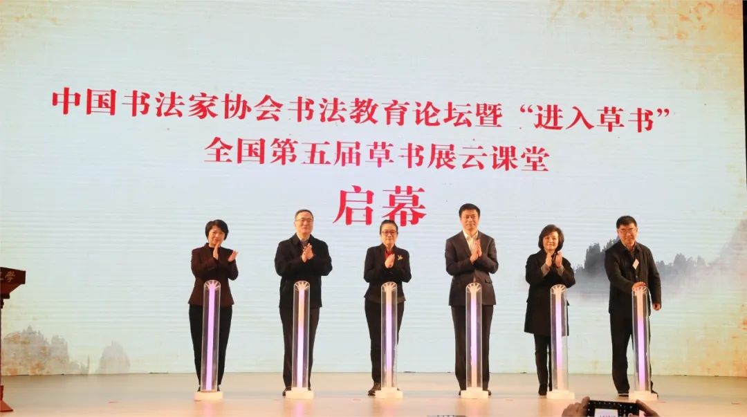孙晓云、李昕、高韵斐、夏煜静、梅兵、代跃共同为书法教育论坛暨“进入草书”——全国第五届草书展云课堂启幕