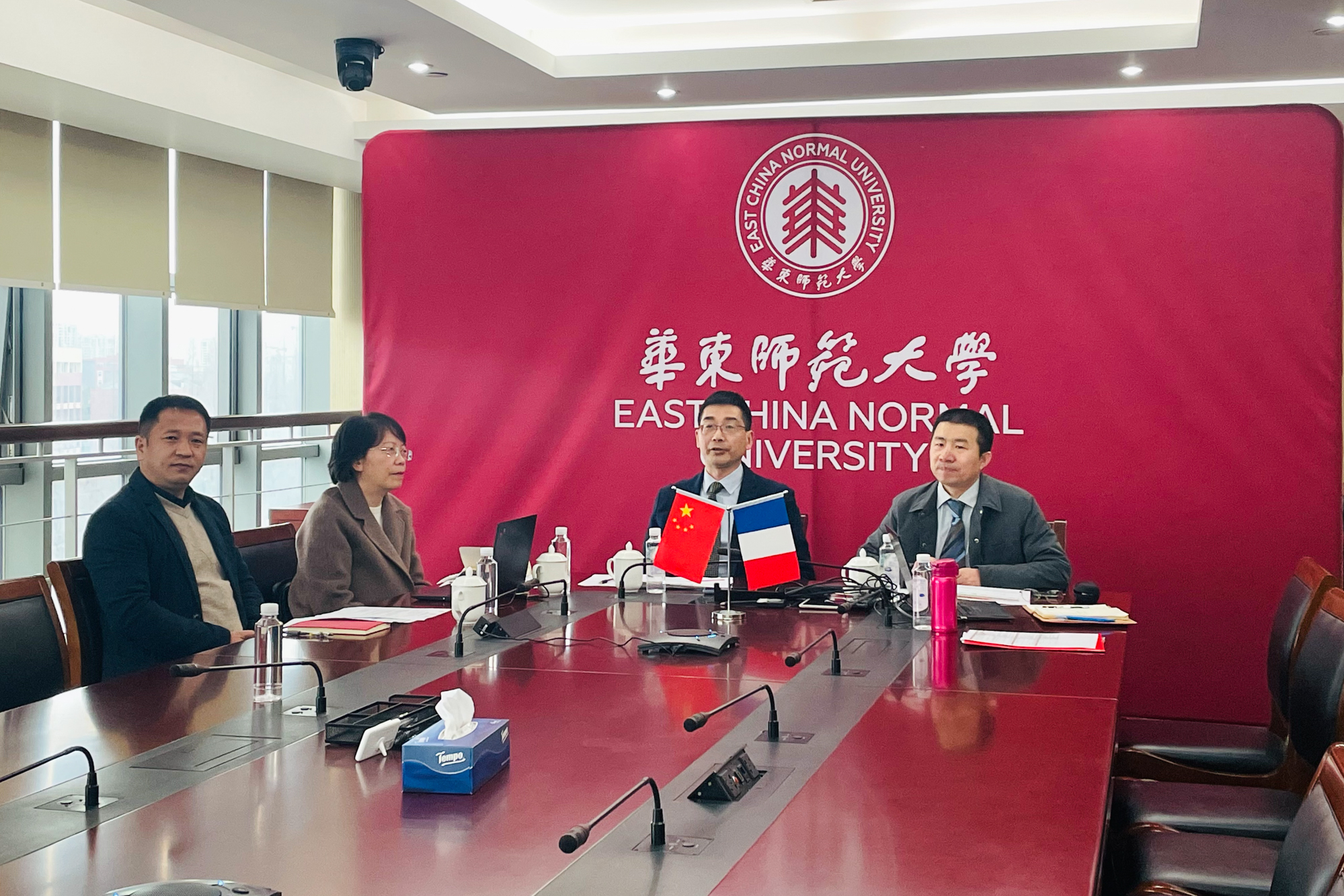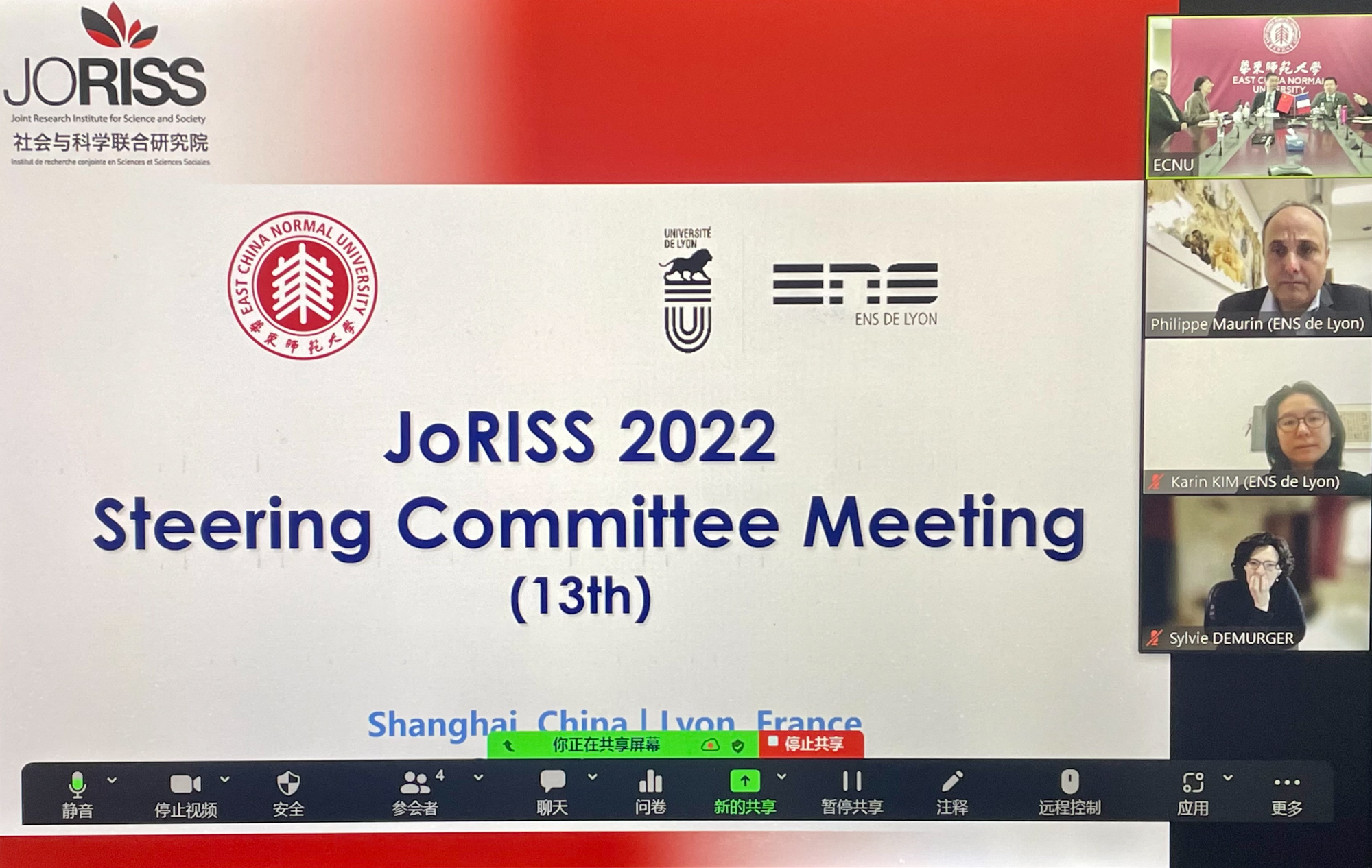 2月28日,中法社会与科学联合研究院(JoRISS)第十三次指导委员会会议通过线上线下相结合的方式举行。华东师大副校长顾红亮,国际合作与交流处处长、JoRISS项目中方总协调员杜震宇,科技处、人文与社会科学研究院相关负责人,法国里昂高师代理科研副校长Sylvie DEMURGER,里昂高师外办主任Phillippe MAURIN,以及两校国际处相关工作人员出席会议。会议由杜震宇主持。